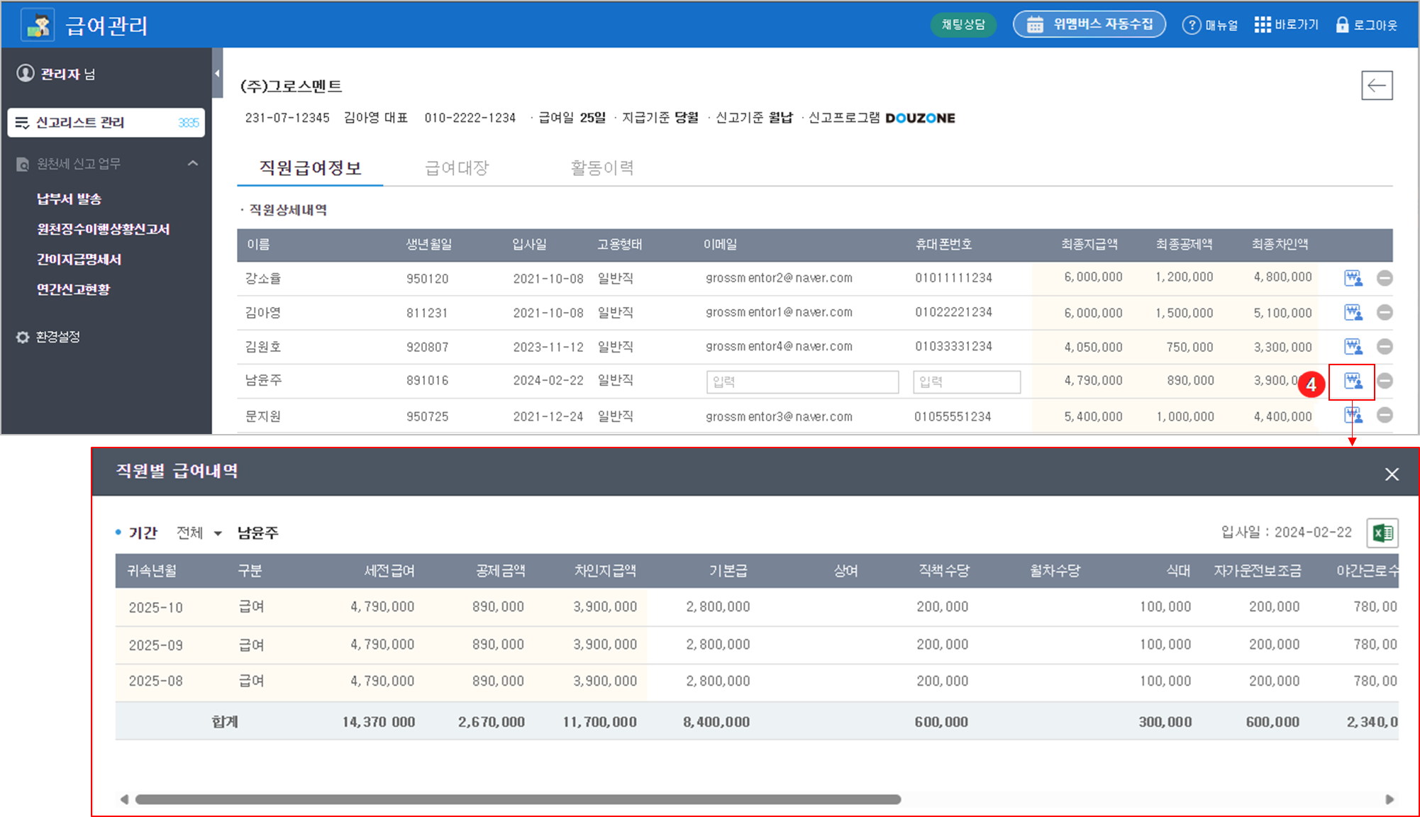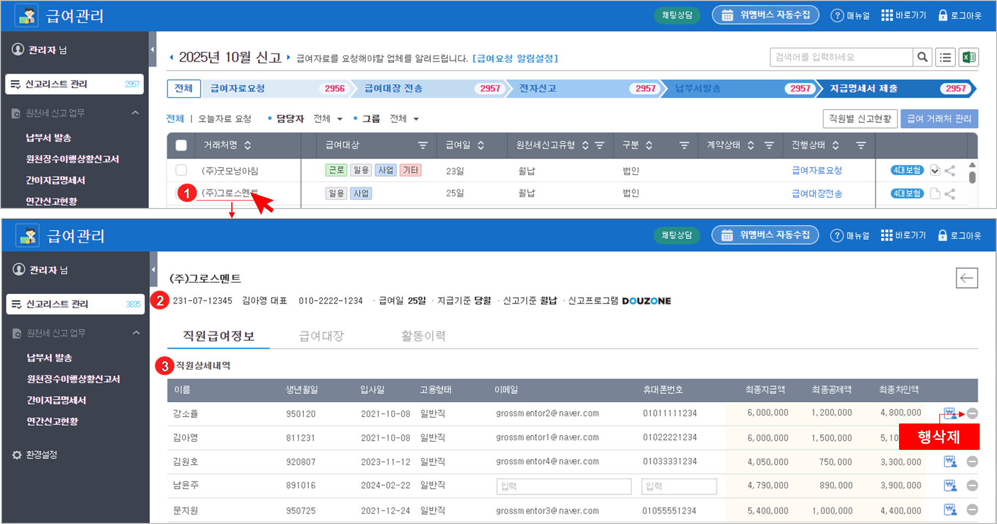 ① [신고리스트 관리] 메뉴에서 거래처를 선택하면 해당 거래처의 직원 급여 정보 화면으로 전환됩니