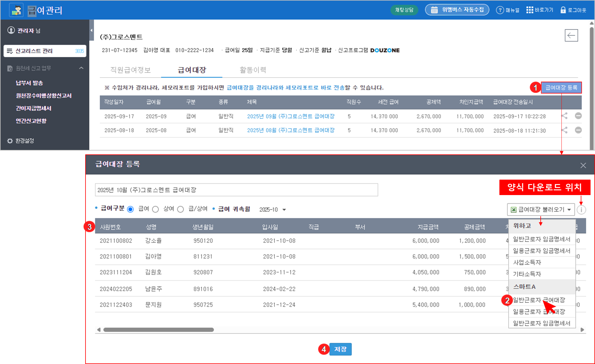 경로 : 신고리스트 관리 > 거래처선택 > 급여대장 탭 > 급여대장 등록