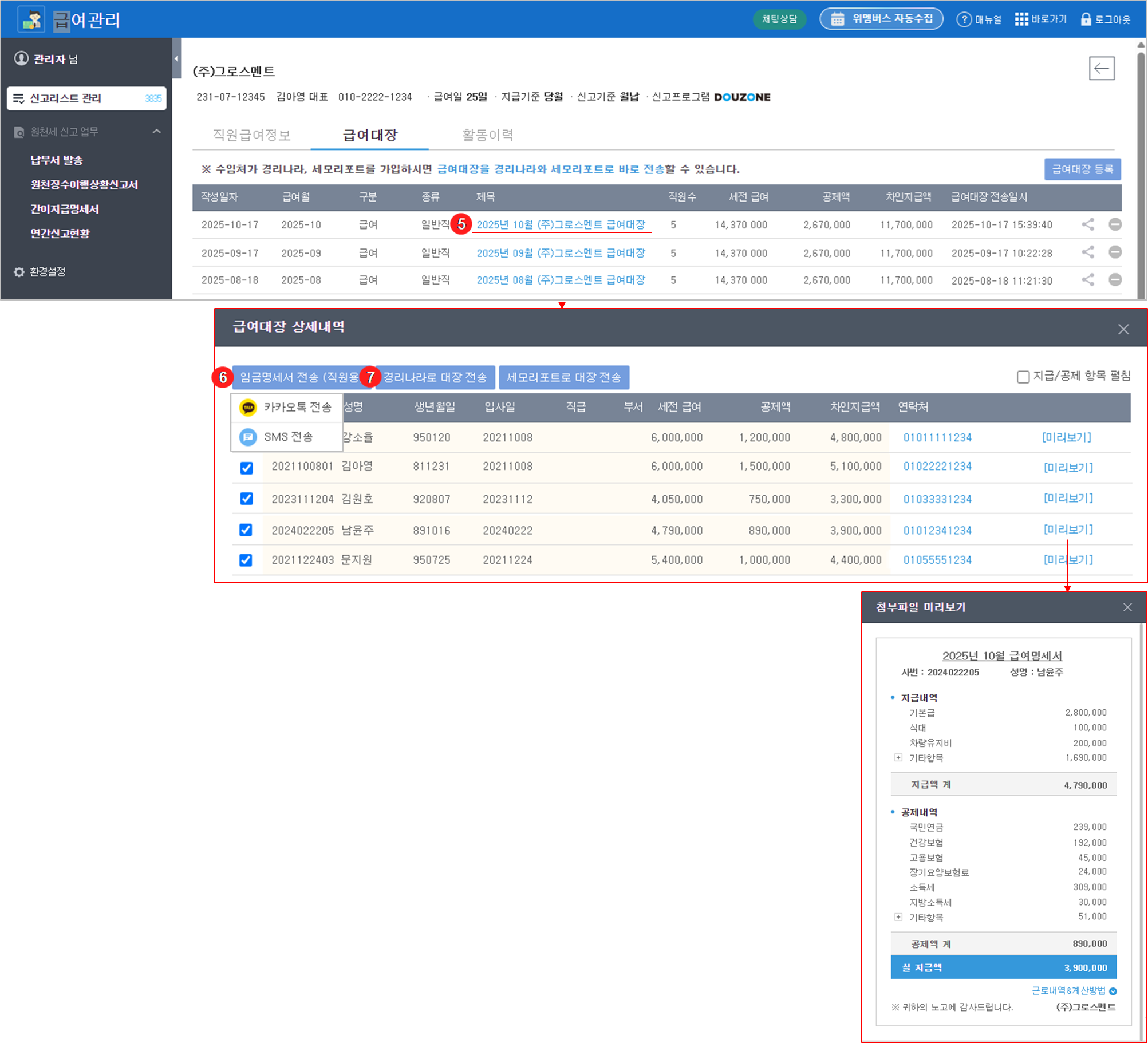 경리나라 가입 수임처는 [경리나라 > 급여대장] 메뉴에서 관리자가 직접 전송할 수 있으므로,