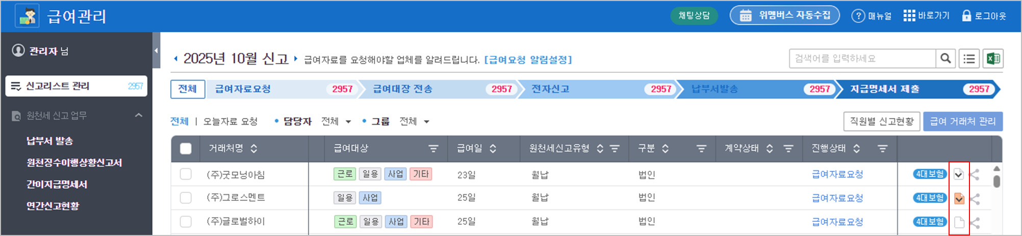 진행상태가 '급여자료요청'인 거래처는 파란색 배경으로 강조 표시됩니다.
