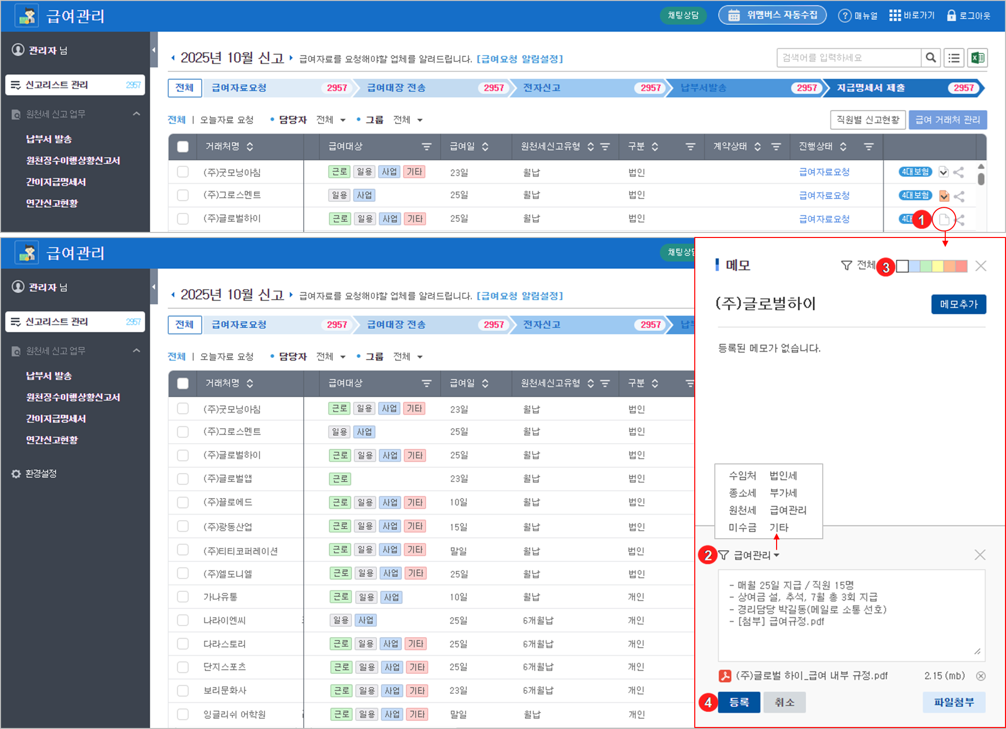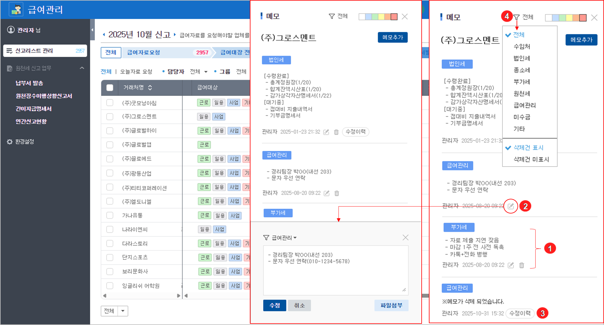 메모 패널 상단의 {전체} 필터를 클릭하여 특정 앱(급여관리, 부가세, 법인세 등)의 메모만 선별 조회할 수 있습니다.