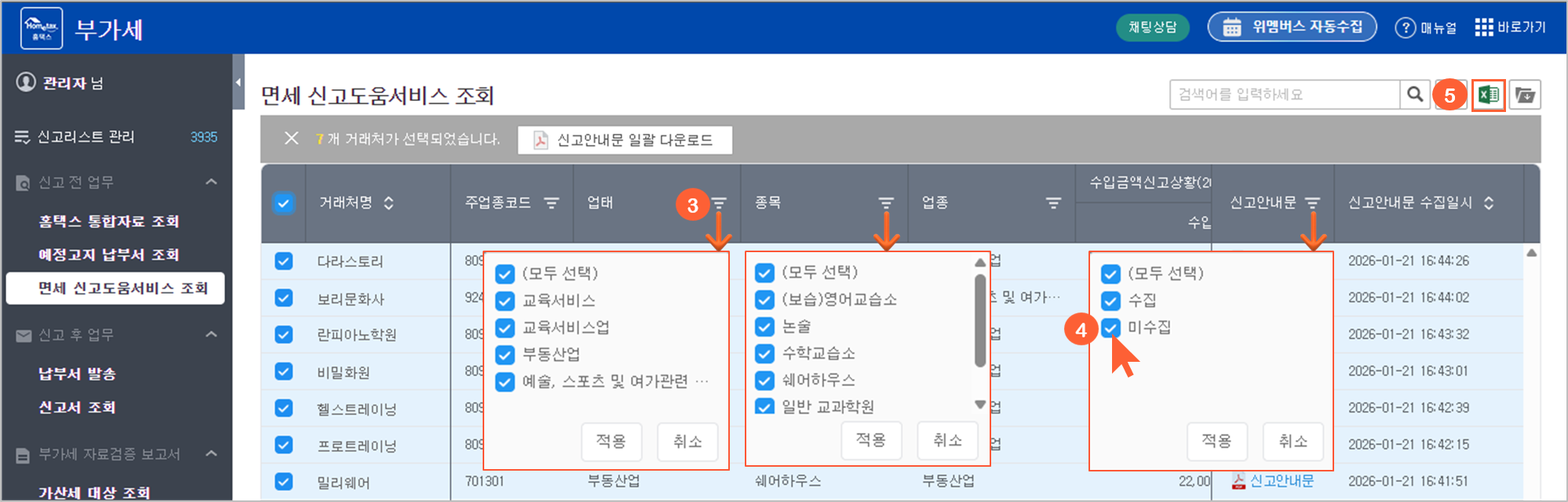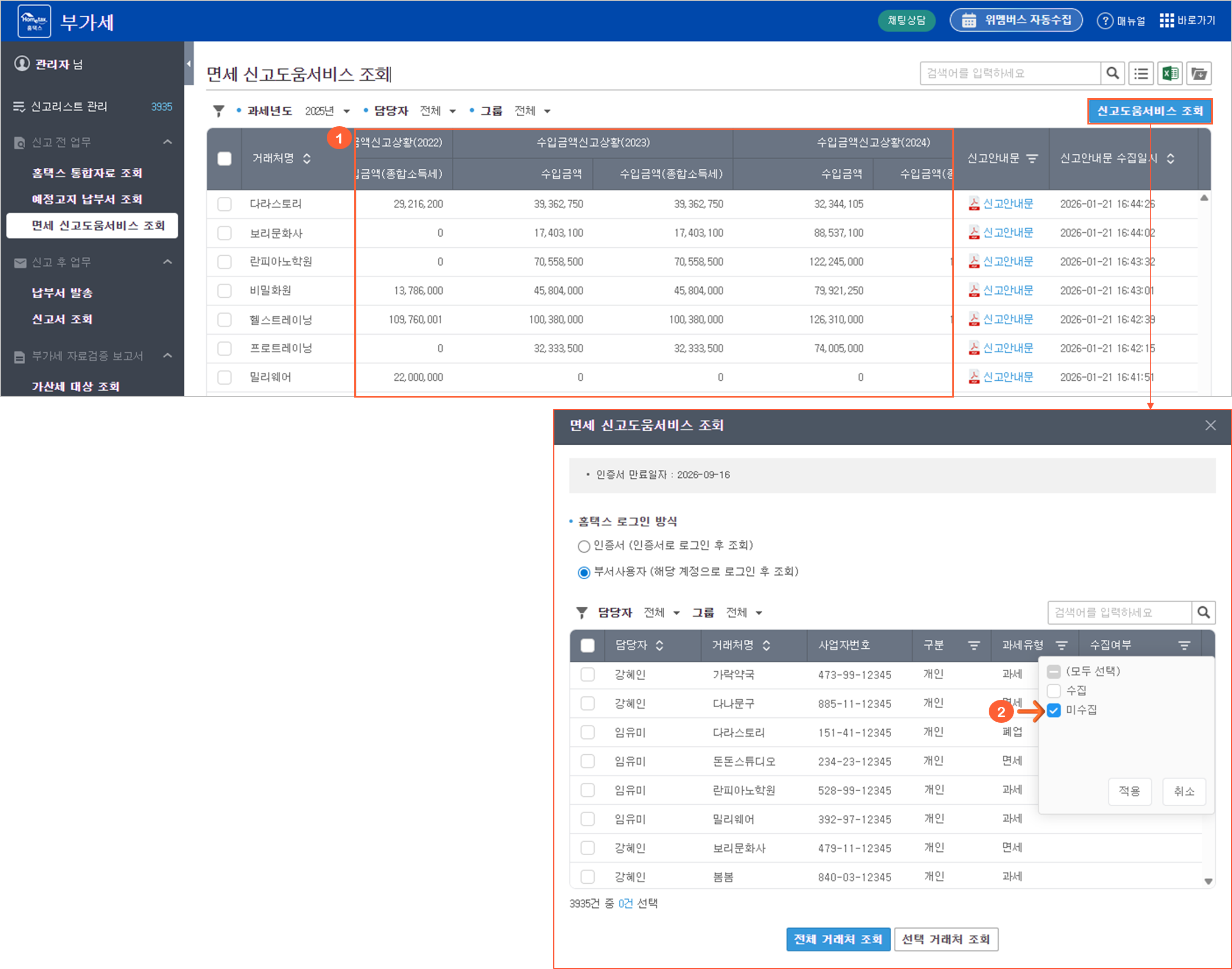 ② {신고도움서비스 조회} 팝업에서 수집 여부를 필터링하여 미수집된 거래처를 일괄 수집할 수 있습