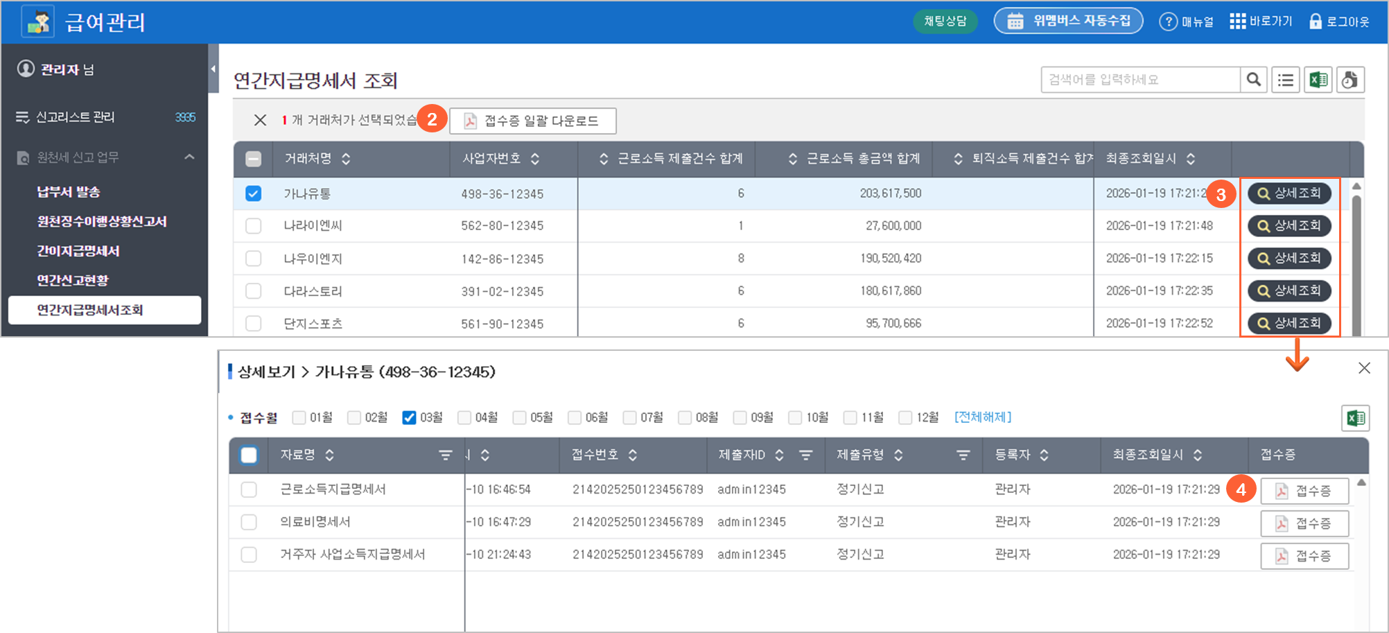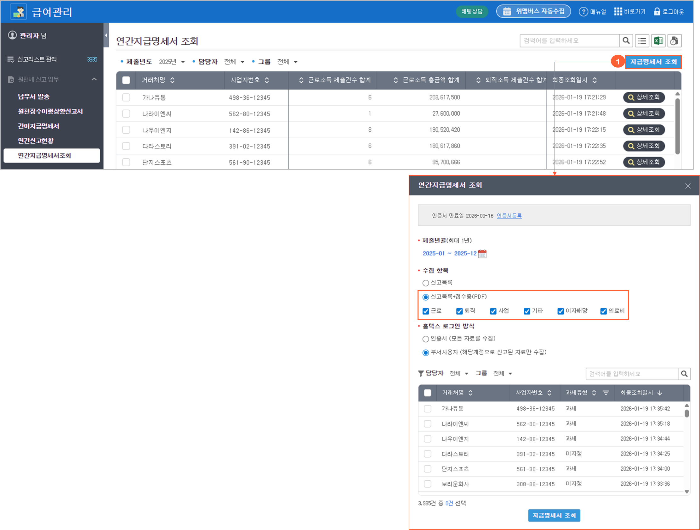 연말정산 시 필요한 지급명세서를 연 단위로 수집할 수 있는 메뉴가 추가되었습니다.
