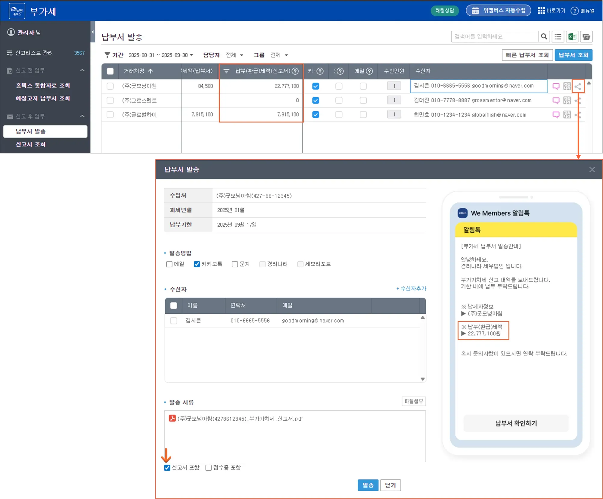 납부서 파일이 없는 경우, 건별/일괄 발송 시 납부(환급)세액이 포함되어 발송됩니다.