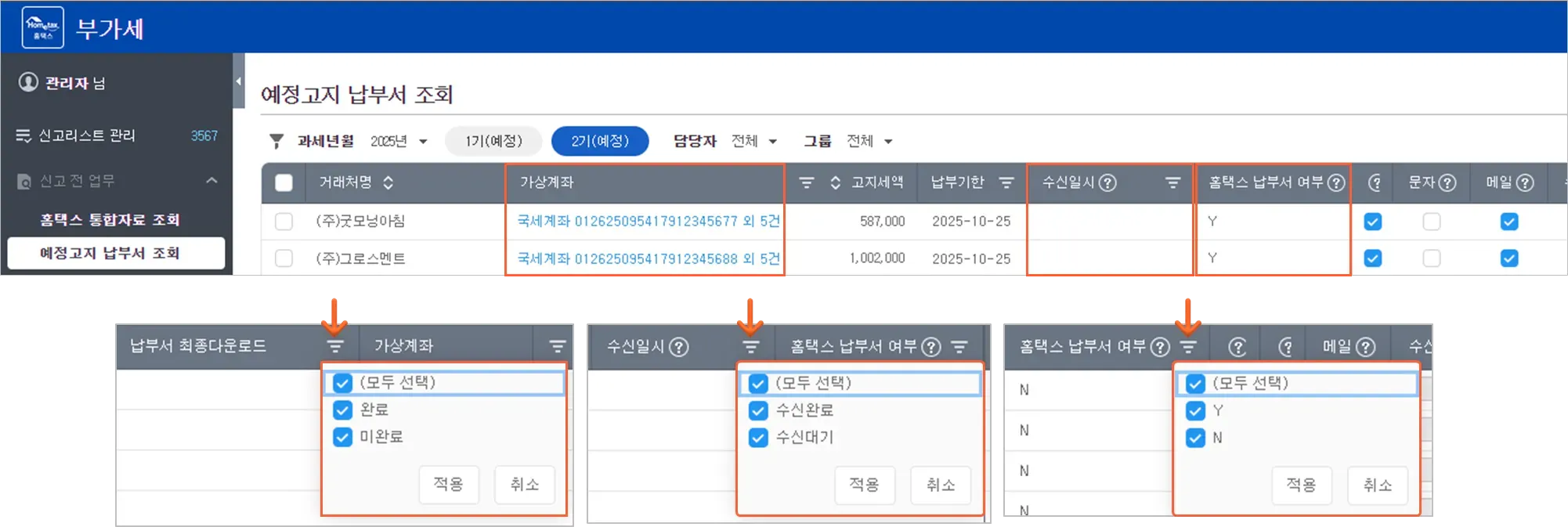 ① 가상계좌, 홈택스 납부여부, 수신일시, 납부서 최종다운로드 등 신규 컬럼 추가