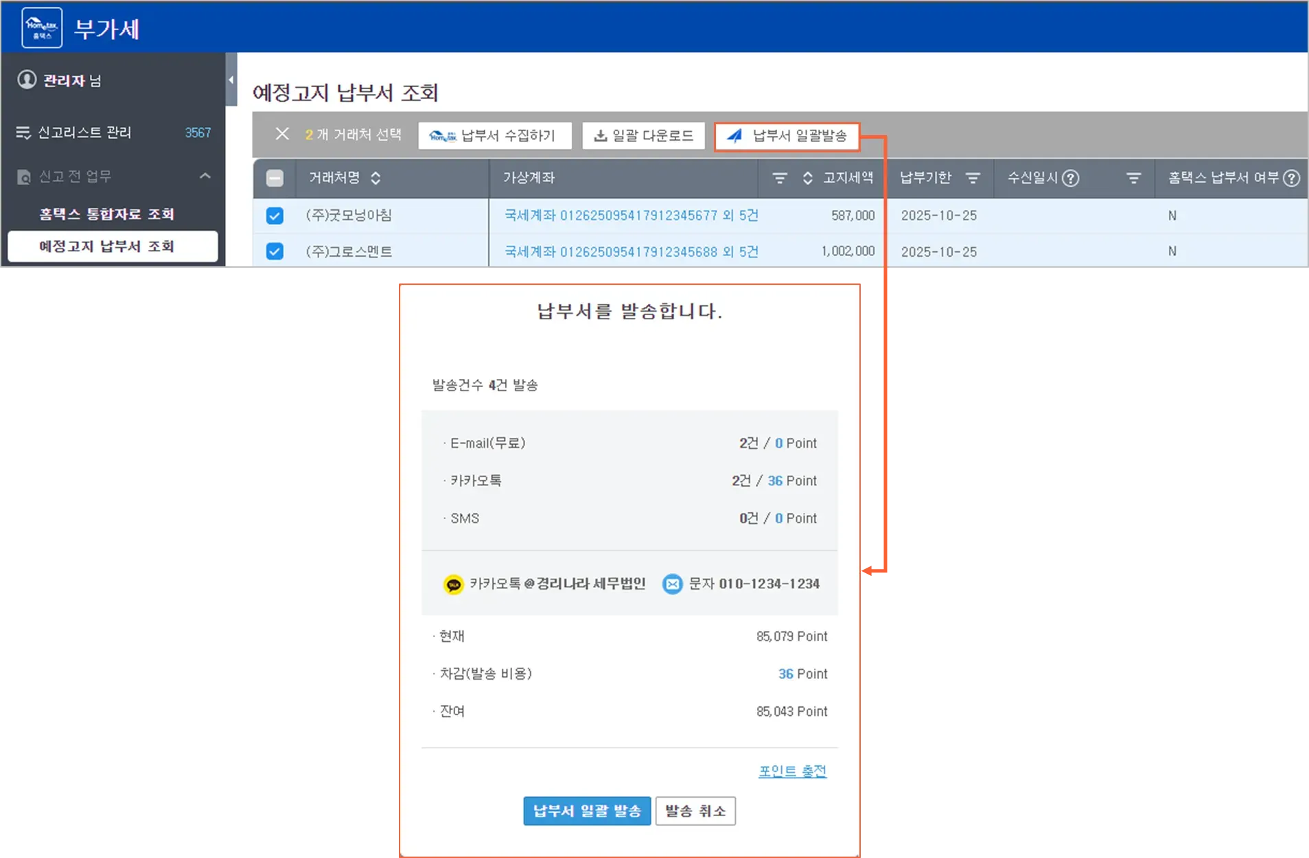예정고지 납부서 파일이 수집된 거래처에 한하여 일괄 발송 가능합니다.