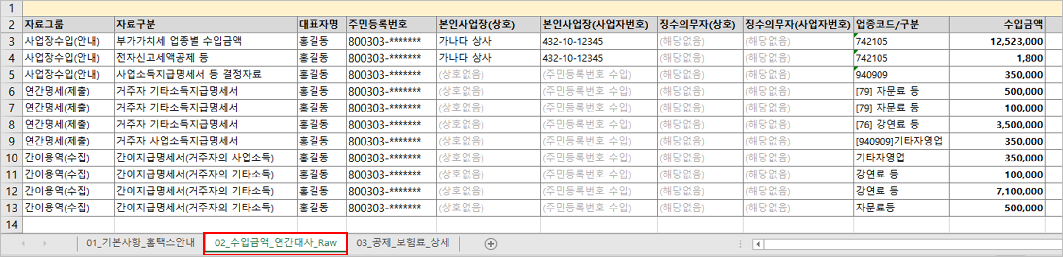 엑셀 보고서 '데이터 대사' 전용 시트 제공: 사업장별 수입금액, 연간지급명세서 제출내역, 간이용역 소득내역을 한눈에 비교 검토할 수 있습니다.