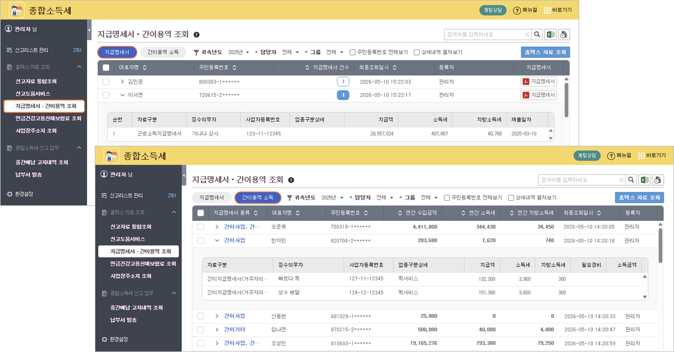 간이용역 조회 탭 신설: 지급명세서와 별도로 간이용역 수집 내역을 관리하며, 이중 그리드 구조를 통해 상세 내역을 편리하게 조회할 수 있습니다.