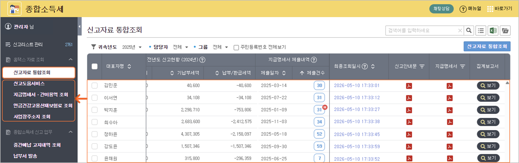 지급명세서 변동 알림 및 분석: 제출 건수나 일자 변동 시 알림 배지가 표시되며, PDF 내 상세 데이터를 자동으로 추출하여 엑셀 및 조회 메뉴에 반영합니다.