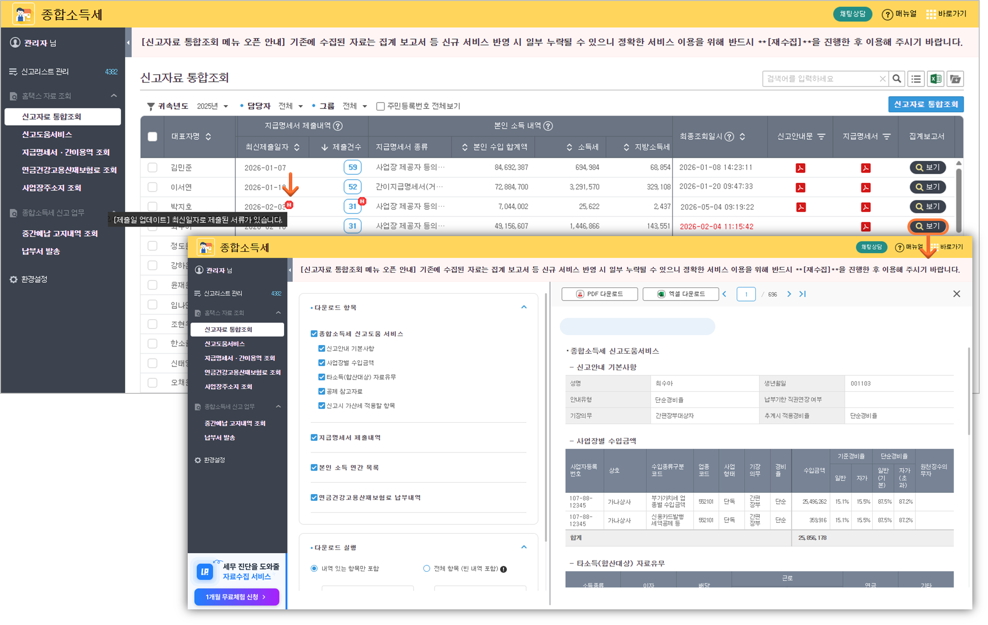신고자료 통합조회 메뉴 신설: 분산된 수집 메뉴를 통합하여 한 화면에서 모든 항목의 데이터를 수집하고 결과를 확인할 수 있습니다.