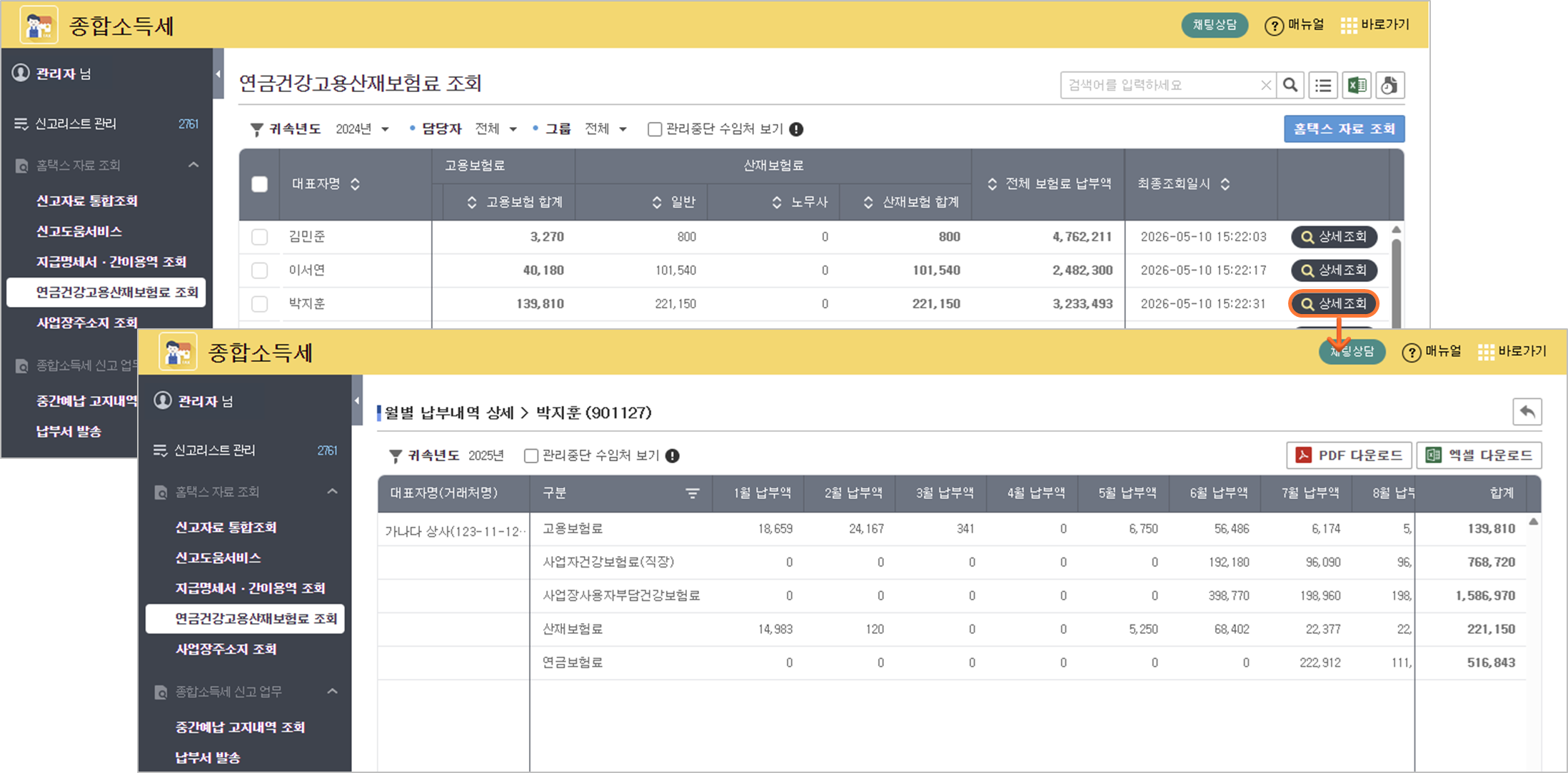 대표자 중심 데이터 집계 전환: 보험료 집계 기준을 대표자 단위로 통합했습니다. 대표자별 개인 및 사업장 합산 보험료를 한눈에 확인하고 상세 내역을 조회할 수 있습니다.