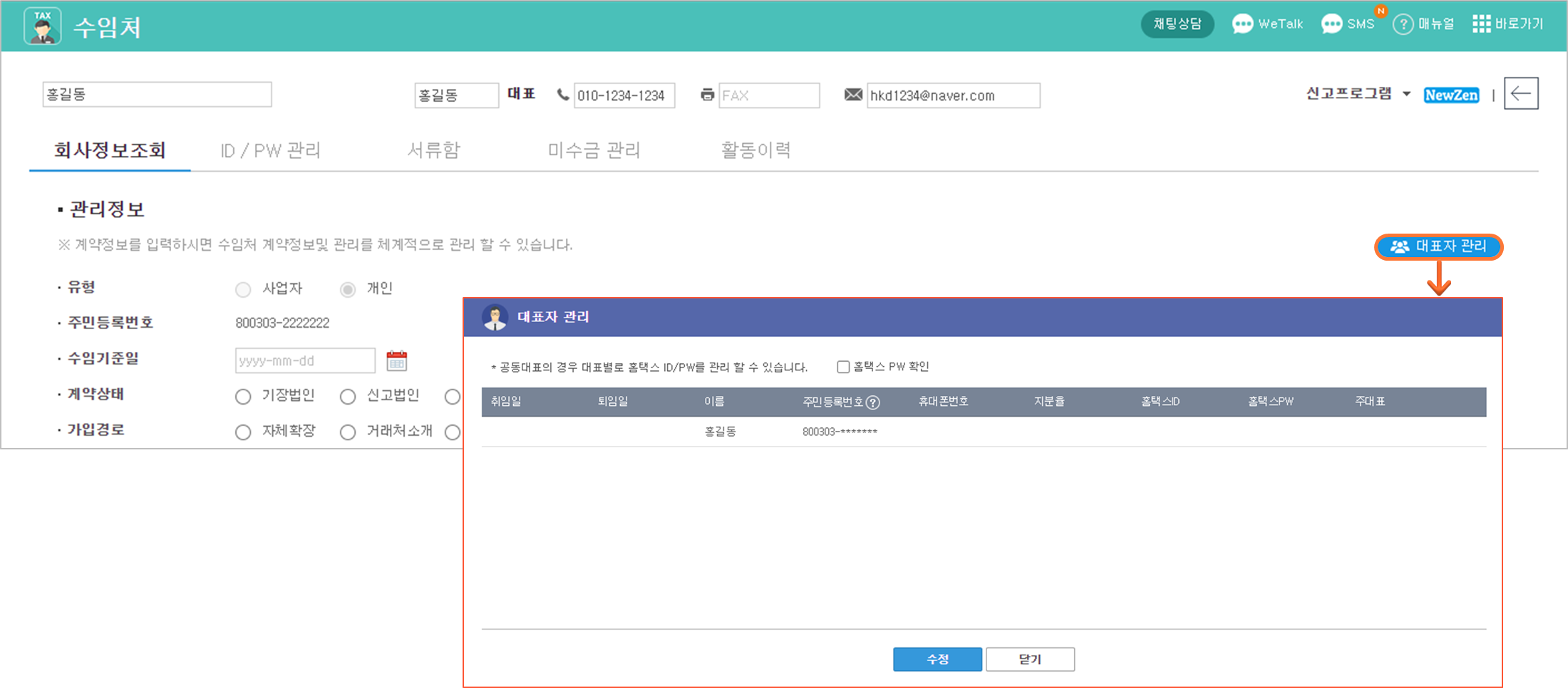 대표자 정보 자동 연동: '개인' 유형 거래처 저장 시 대표자 정보가 자동으로 등록되어 종합소득세 데이터 수집 시 즉시 활용됩니다.