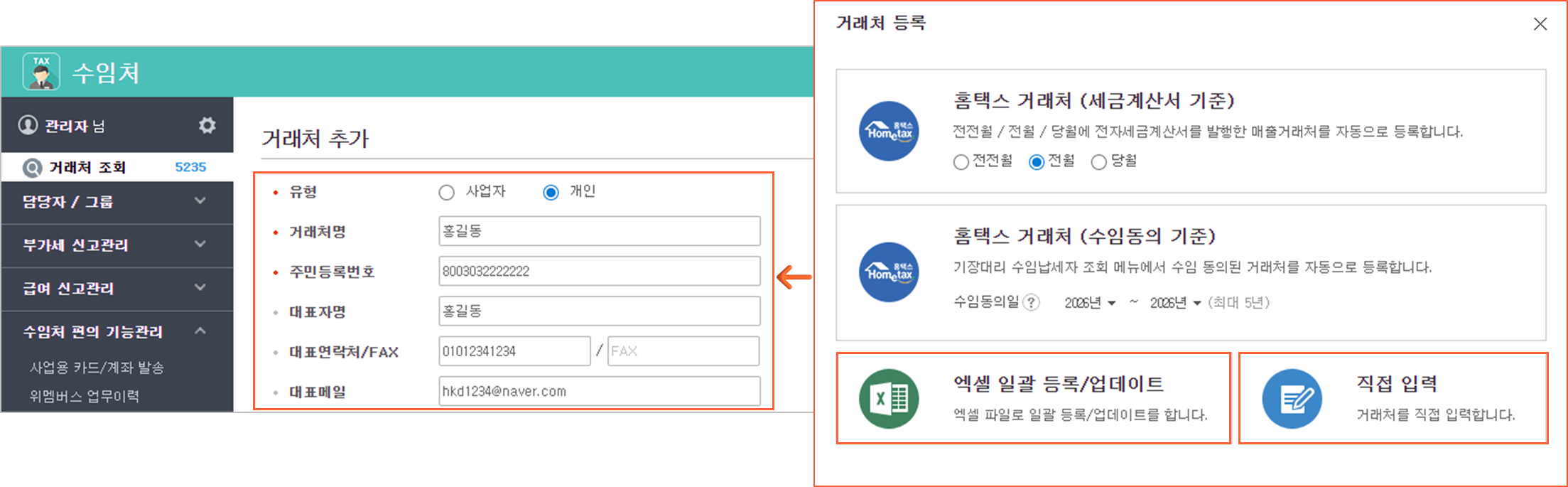 등록 방식 간소화: 이름과 주민등록번호만으로 간편 등록이 가능하며, 엑셀 일괄 등록 시에도 '개인' 유형을 선택하여 업로드할 수 있습니다.