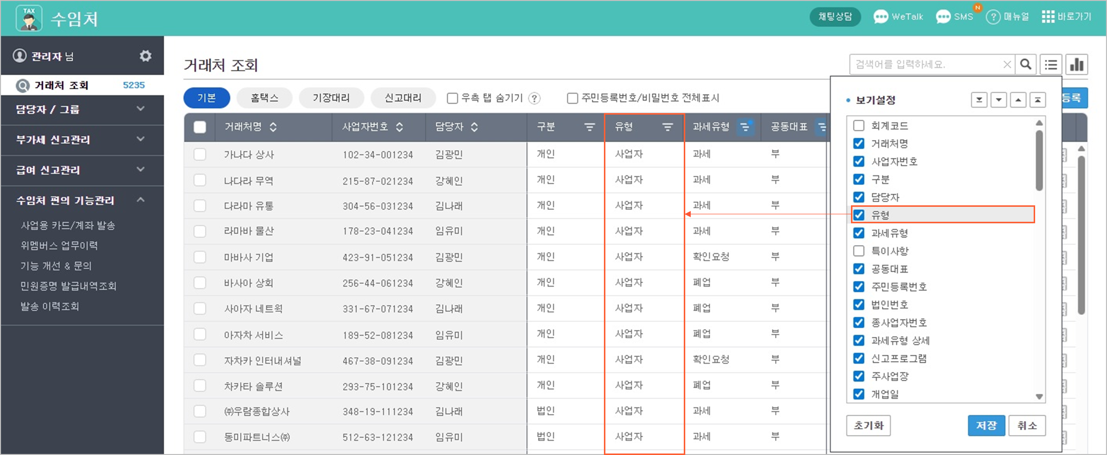 유형 컬럼 추가: 거래처 조회 화면에 '유형' 컬럼을 추가하여 사업자와 개인 수임처를 쉽게 구분할 수 있습니다.