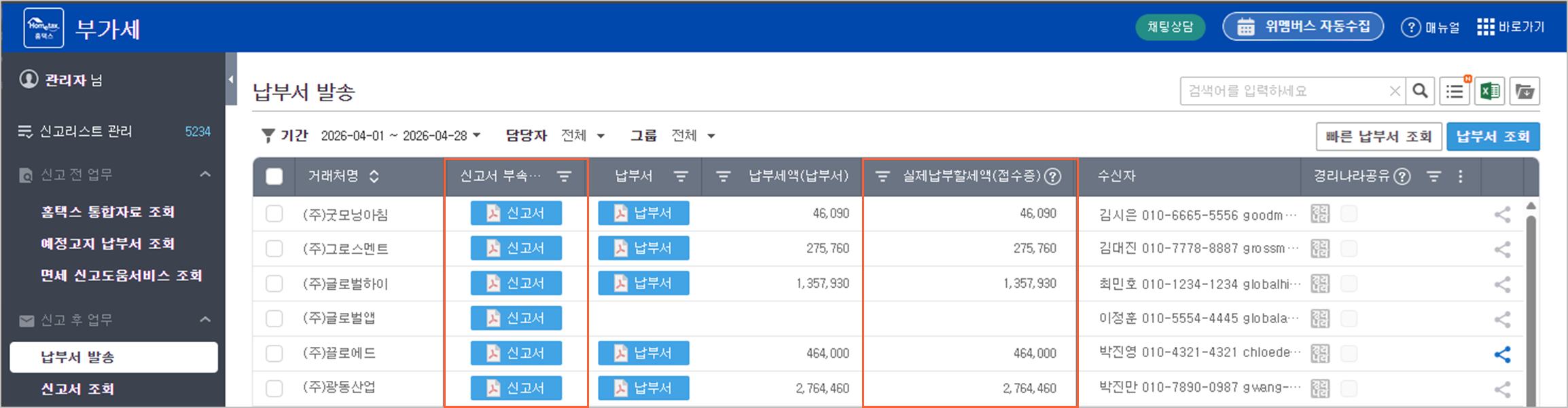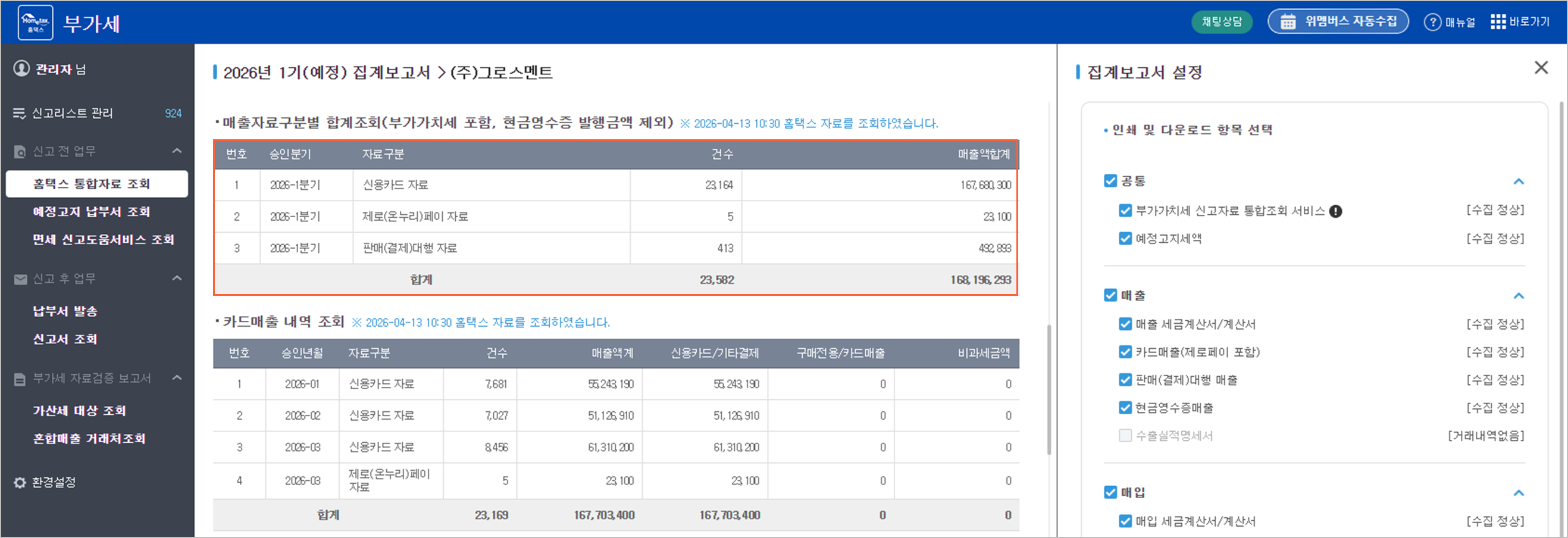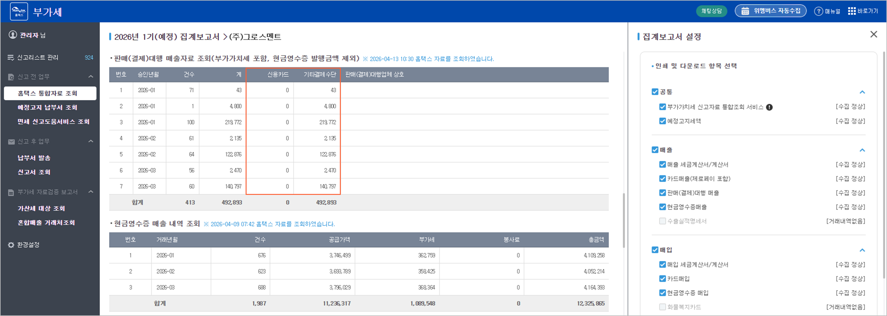 부가세 신고 자료 수집 고도화: 매출자료 구분별 합계조회 및 부속서류/접수증 기반 실납부세액 확인 기능 추가