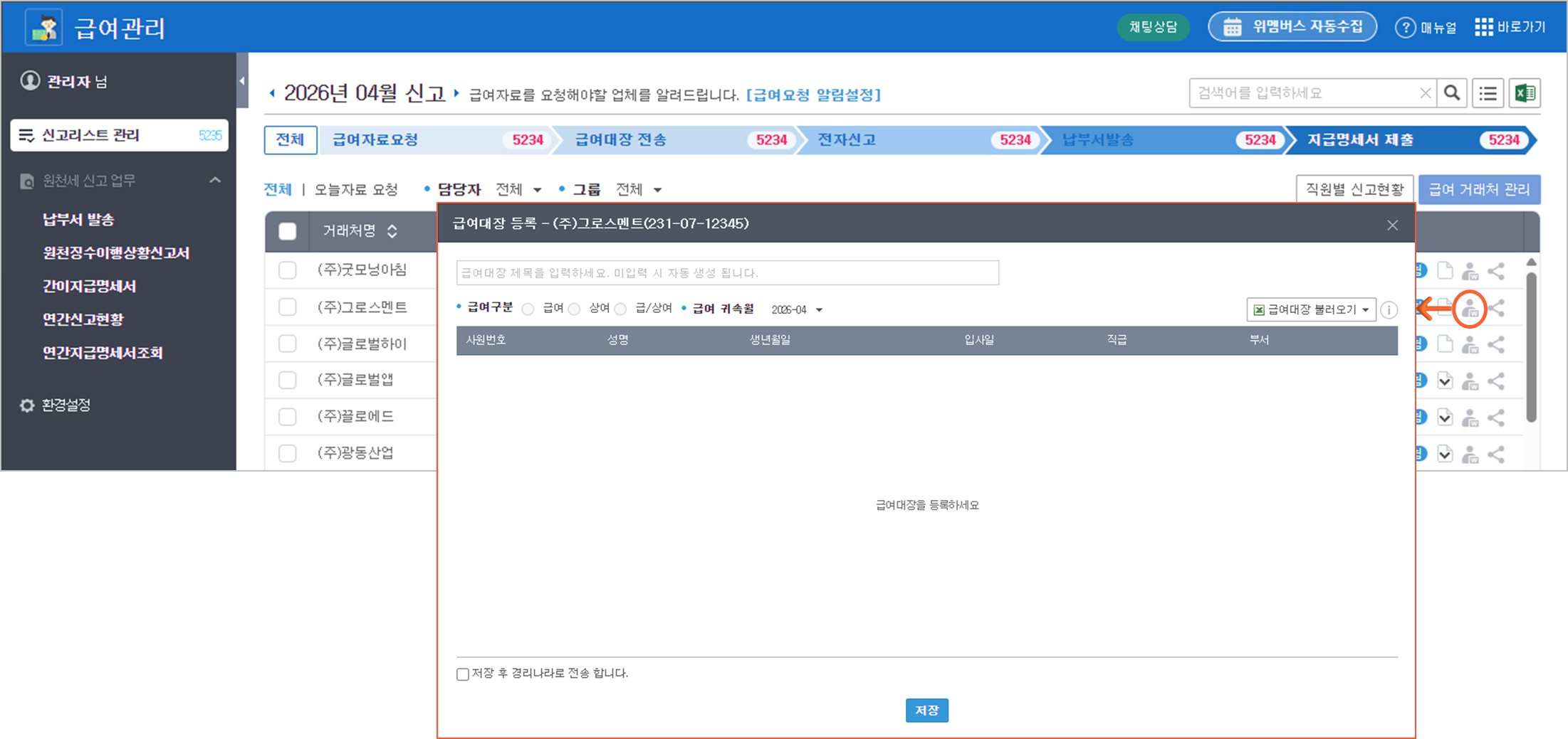 급여대장 등록 퀵 아이콘 추가: 신고리스트 관리 메인 화면에서 아이콘 클릭 한 번으로 급여대장 등록 화면으로 바로 이동합니다.
