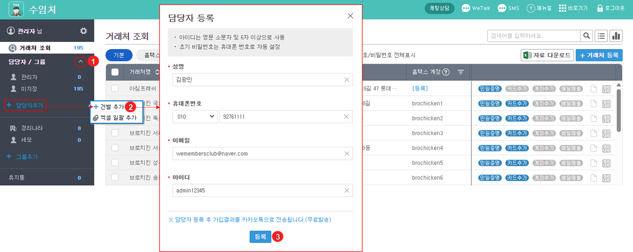 ③ 성명, 휴대폰번호, 메일주소, 아이디를 필수로 입력 후 {등록}을 클릭하면 담당자에게 카카오 알림톡으로 로그인 정보가 전송됩니다.