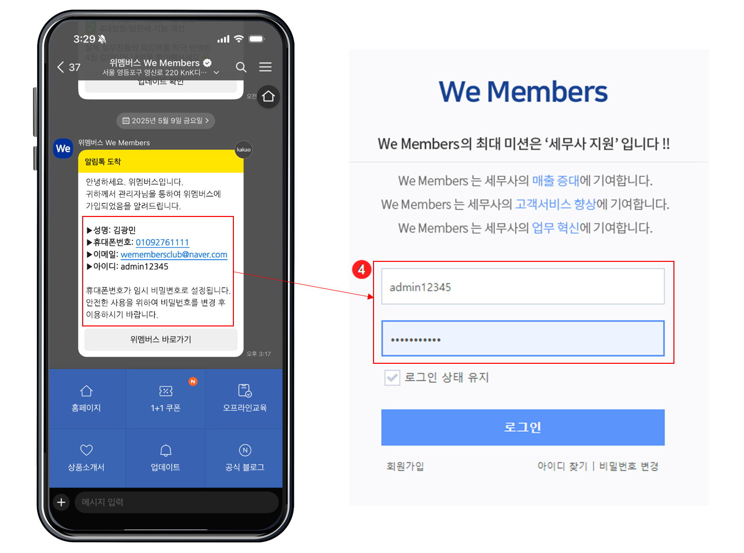④ 초대 받은 직원은 카카오 알림톡으로 전송된 로그인 정보를 확인 후 위멤버스 홈페이지에서 로그인을 진행하면 위멤버스 회원 가입이 완료됩니다.