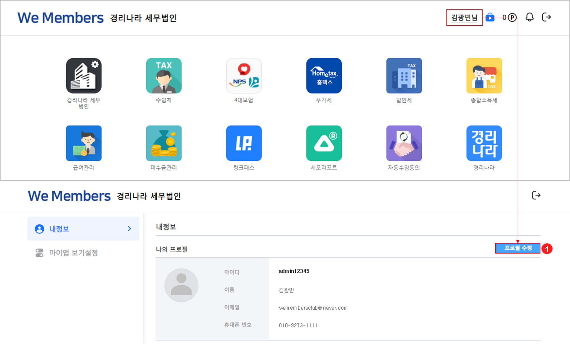 ① 위멤버스 우측상단 로그인 사용자명을 클릭합니다.