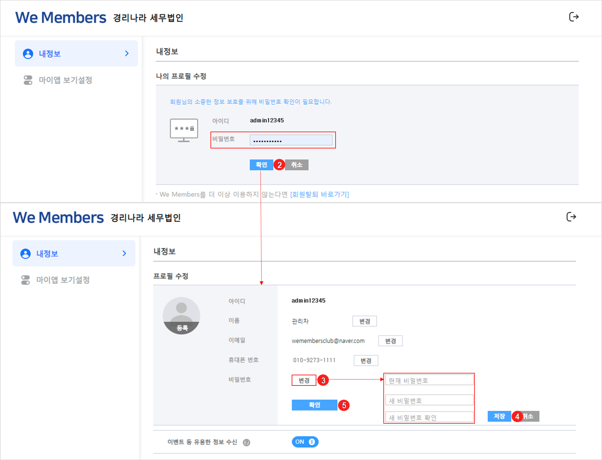 ⑤ {확인}을 클릭하면 비밀번호 변경이 완료됩니다.