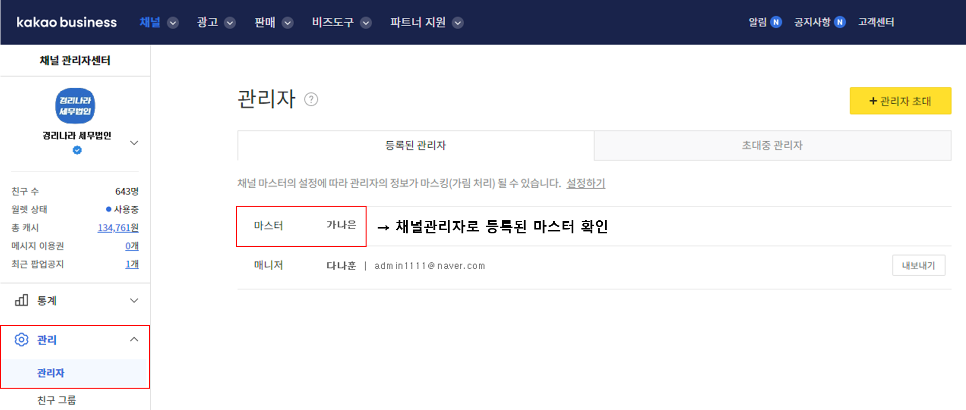 경로 : [카카오톡채널 관리자센터>관리>관리자]