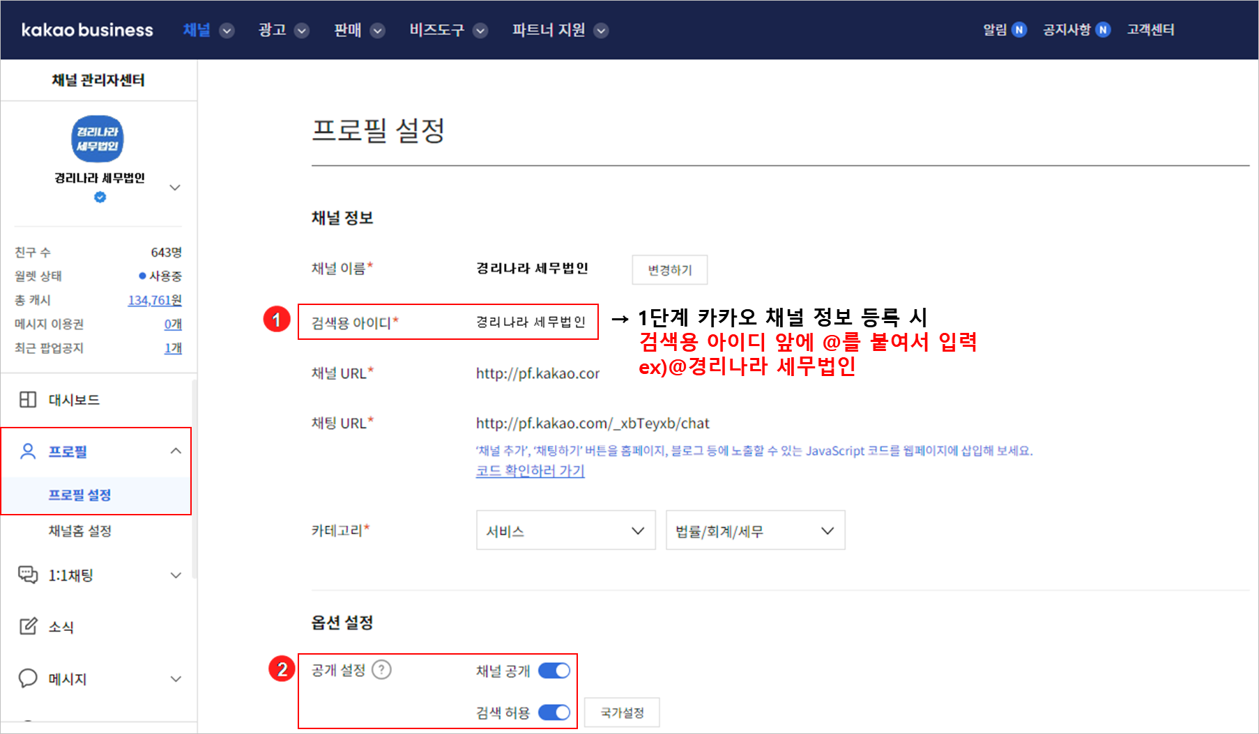 카카오 채널 정보 등록 시 검색용 아이디를 입력 하므로 아이디를 확인합니다.