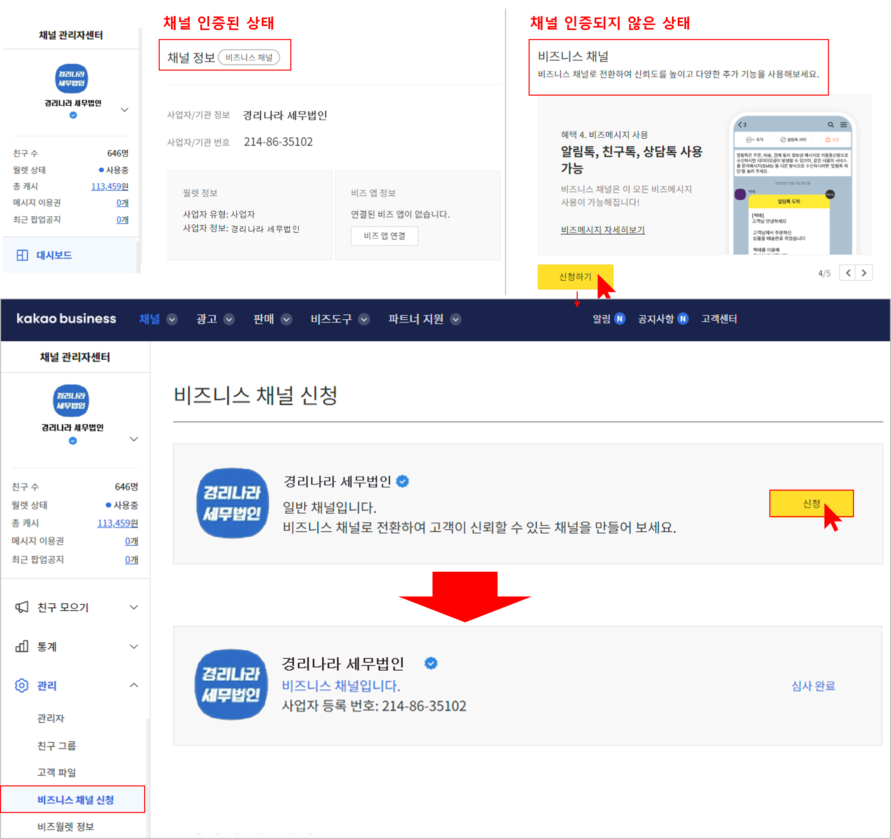 비즈니스 채널이 아닌 경우[카카오톡채널 관리자센터>관리>비즈니스 채널 실청] 메뉴에서 비즈