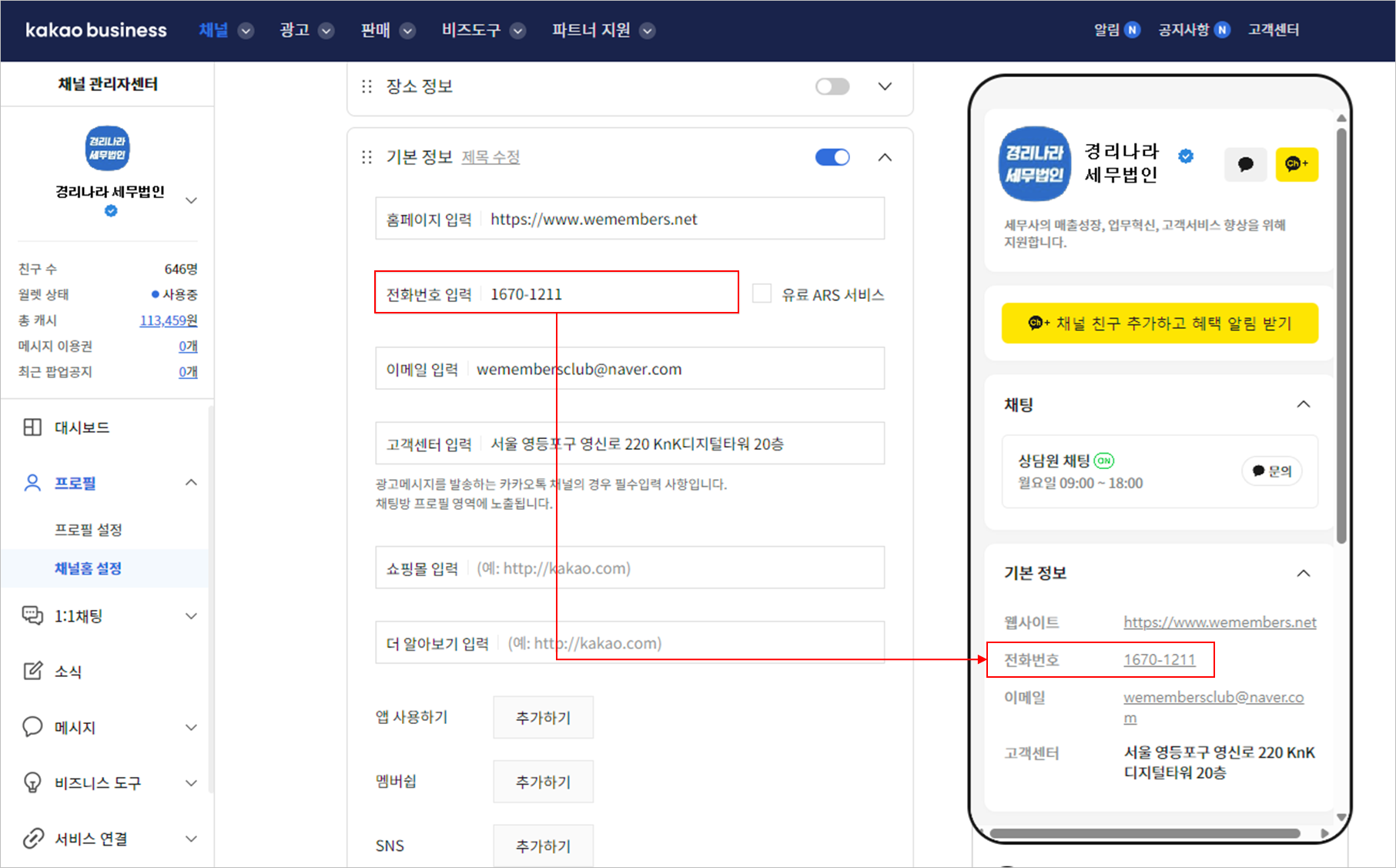 [카카오톡채널 관리자센터>프로필>홈탭카드설정>기본정보]에 전화번호 및 고객센터 정보가 입