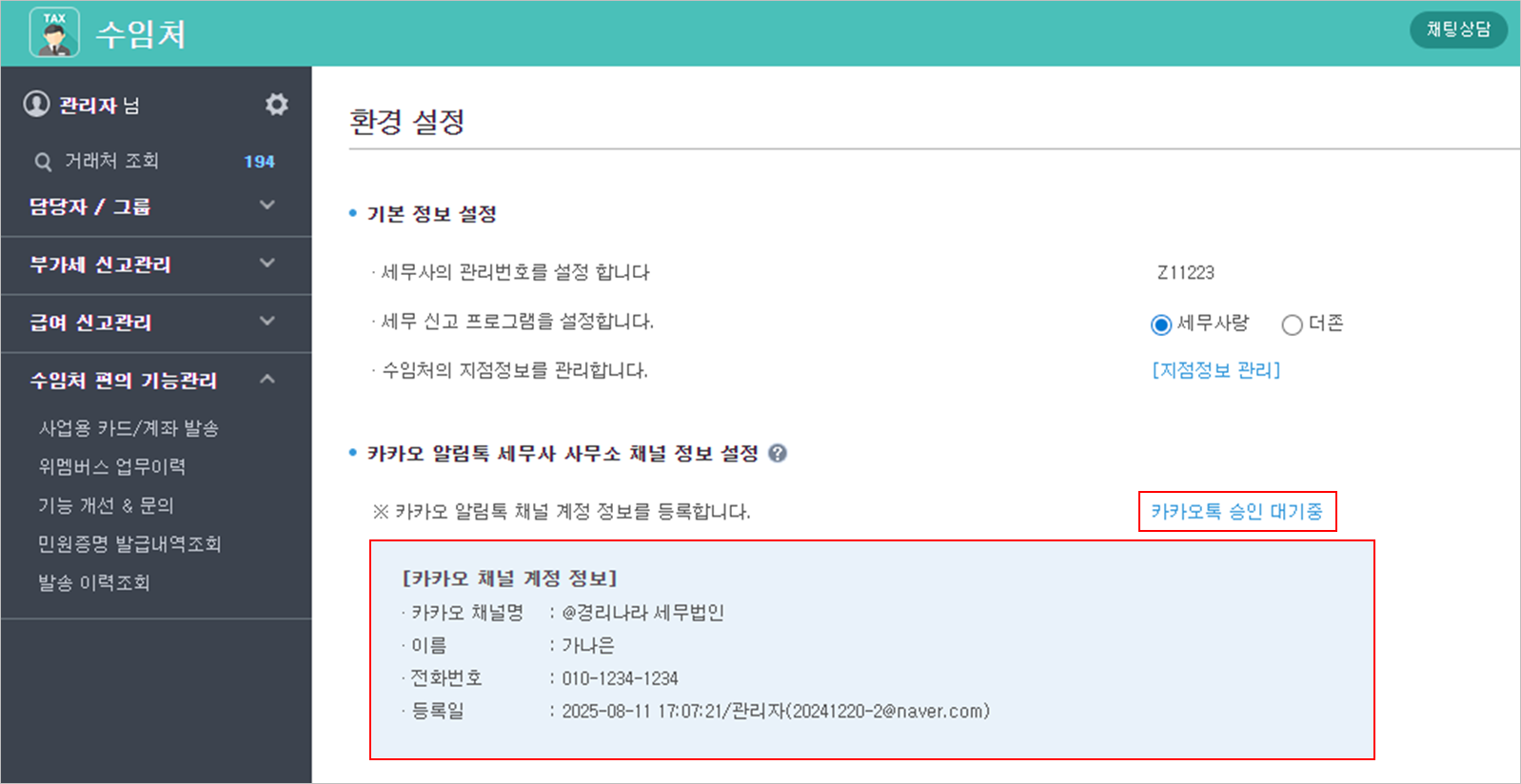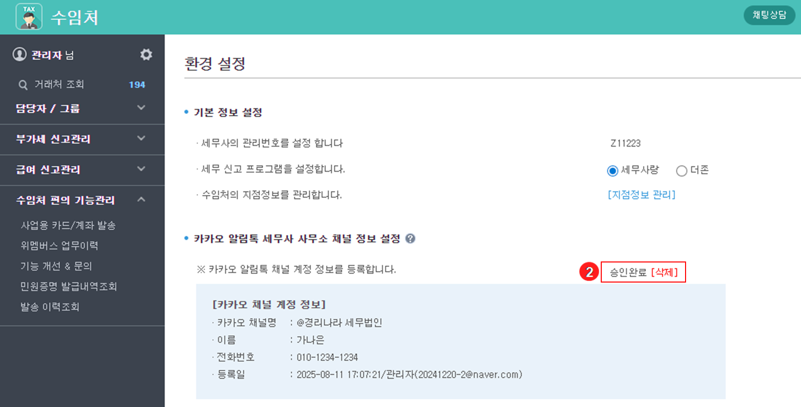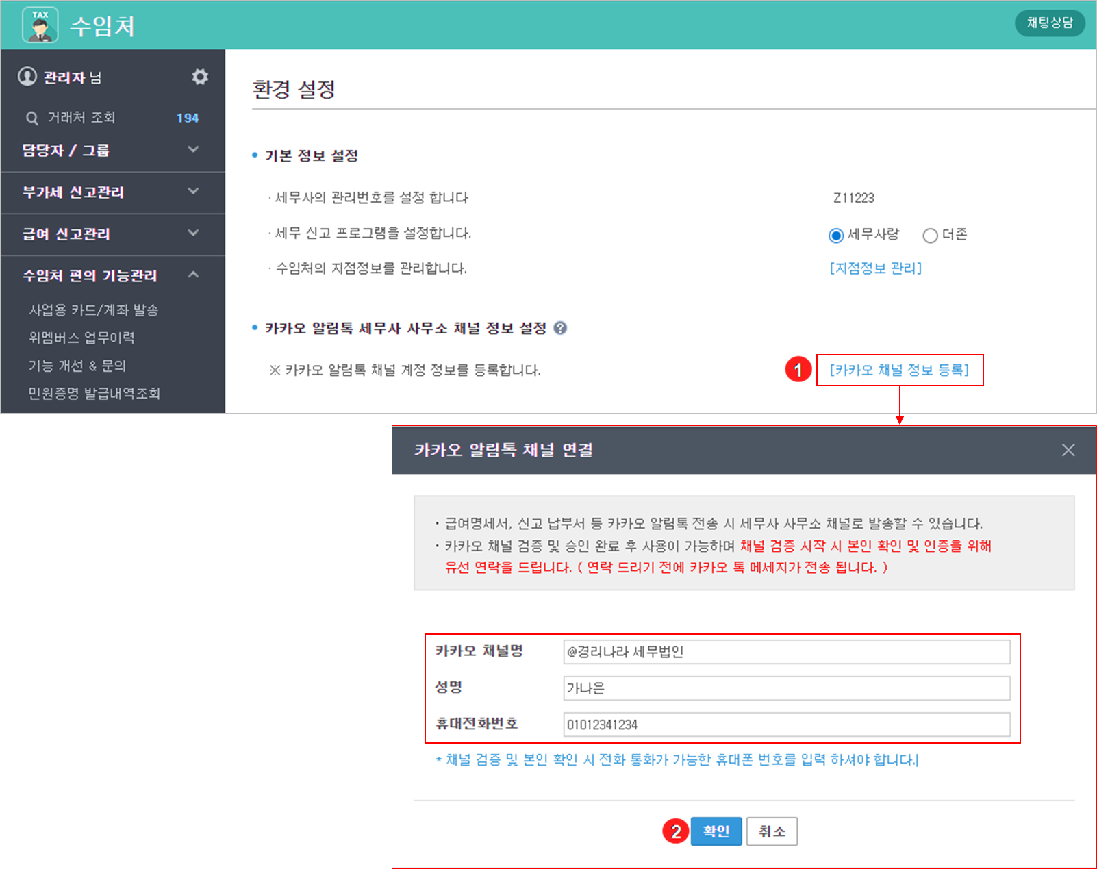 ① [수임처>환경설정( )>카카오 채널 정보] 등록 클릭