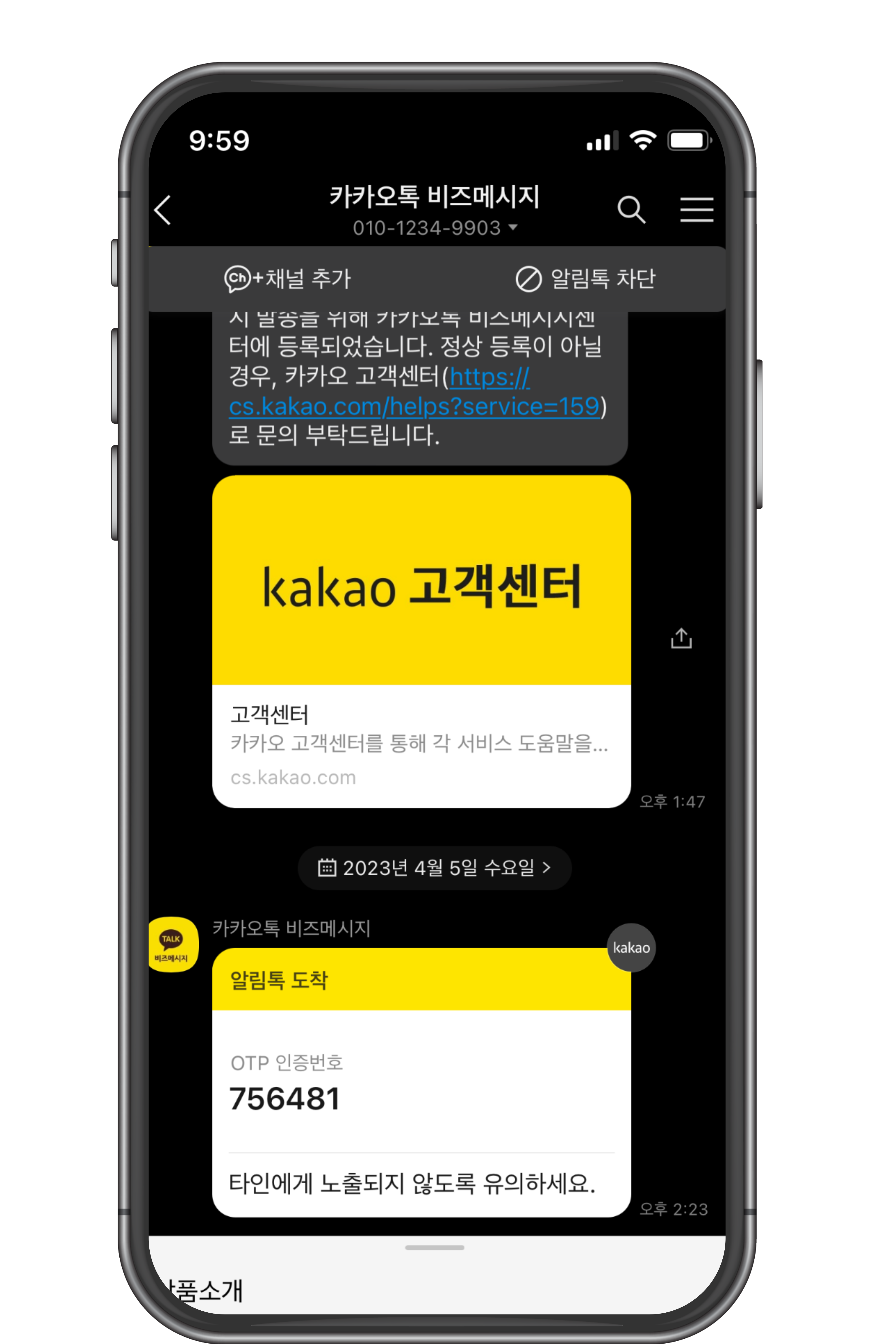 대략 1분 후 ‘알림톡 수신 채널 담당자’가 OTP 인증번호를 확인하기 위해 담당자 휴대폰으로 전화 할 예정이며, 알림톡으로 수신된 숫자 6자리 번호를 알려주시기 바랍니다.