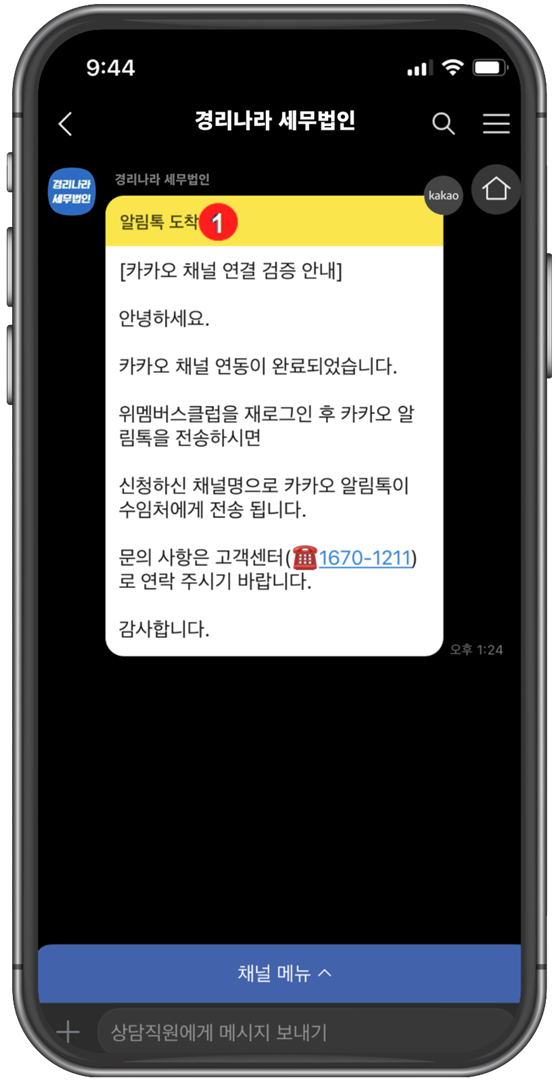 이를 통해 알림톡을 받는 수임처가 채널명을 확인하면 세무사 사무실 채널명이 표기된것을 확인할 수 있습니다.