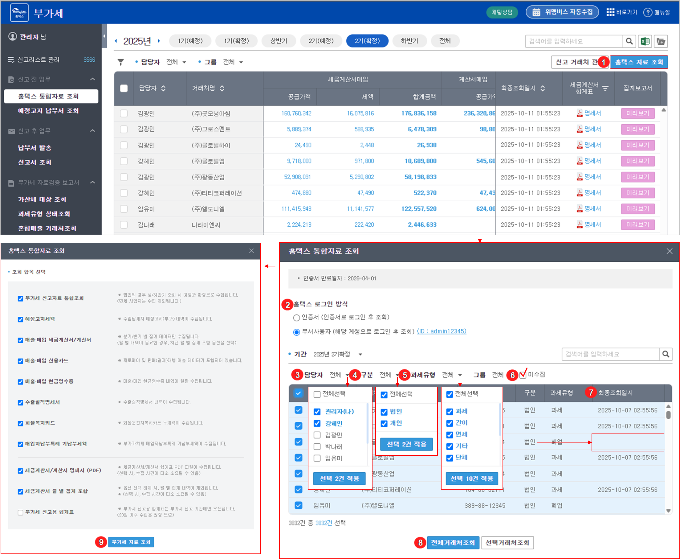 모든 자료는 [홈택스 > 세무대리 > 세무대리 공통] 메뉴에서 수집됩니다.