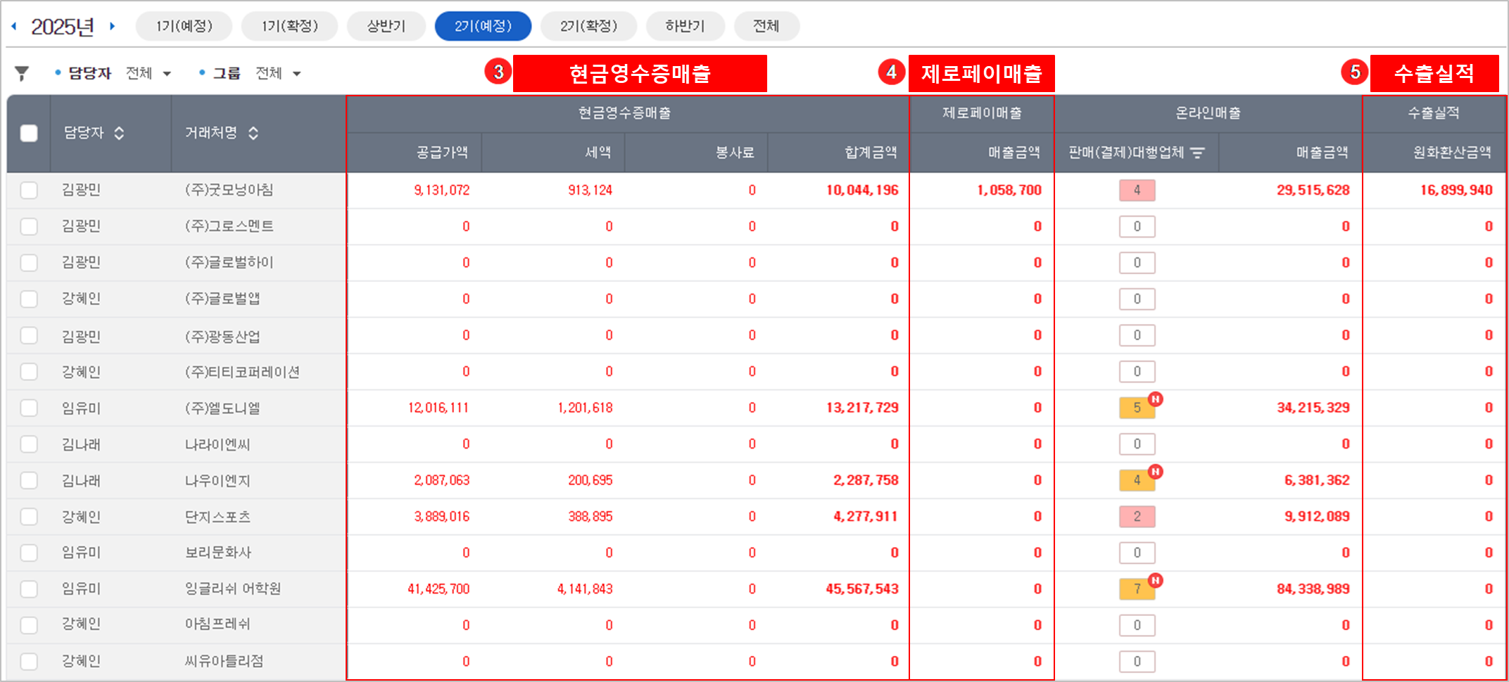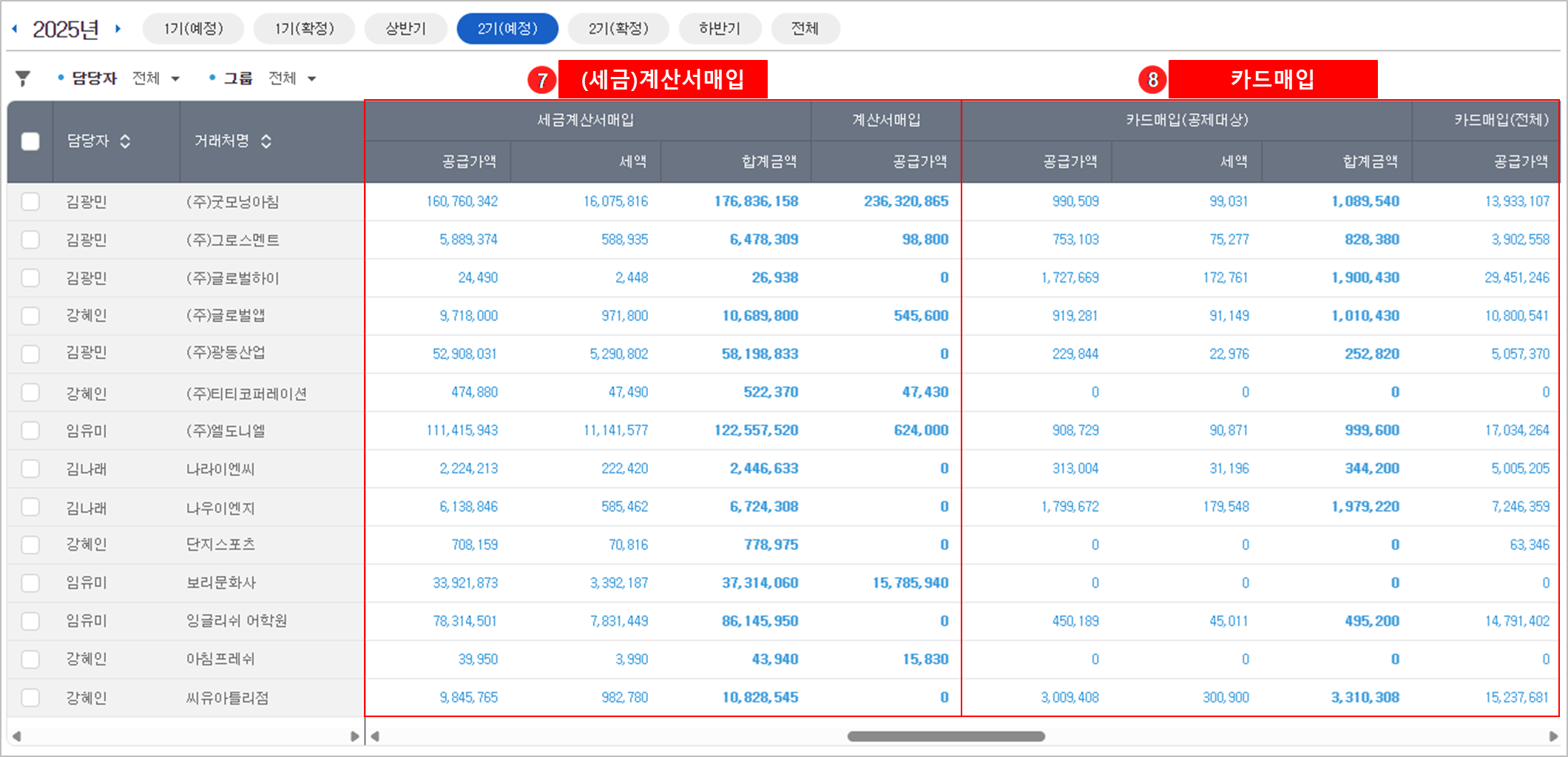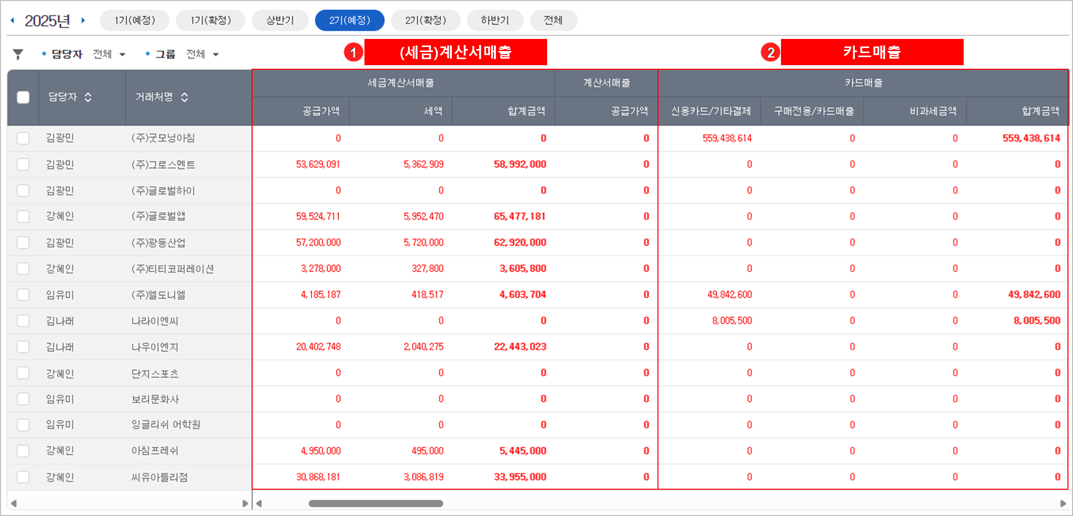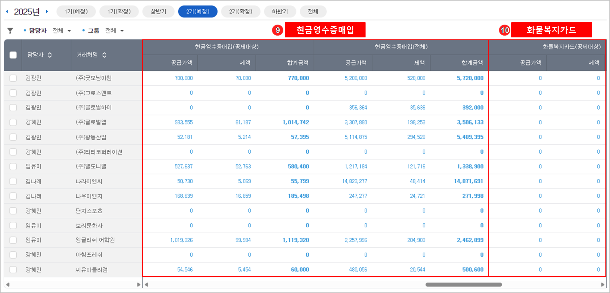 '전체 거래처' 또는 '특정 담당자'의 거래처만 선택 조회할 수 있습니다.