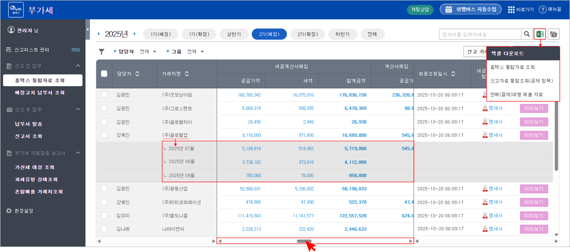 '스케줄러' 또는 '실시간'으로 수집된 홈택스 통합자료를 확인하고, 엑셀로 다운로드하여 상세 내역을 관리할 수 있습니다.