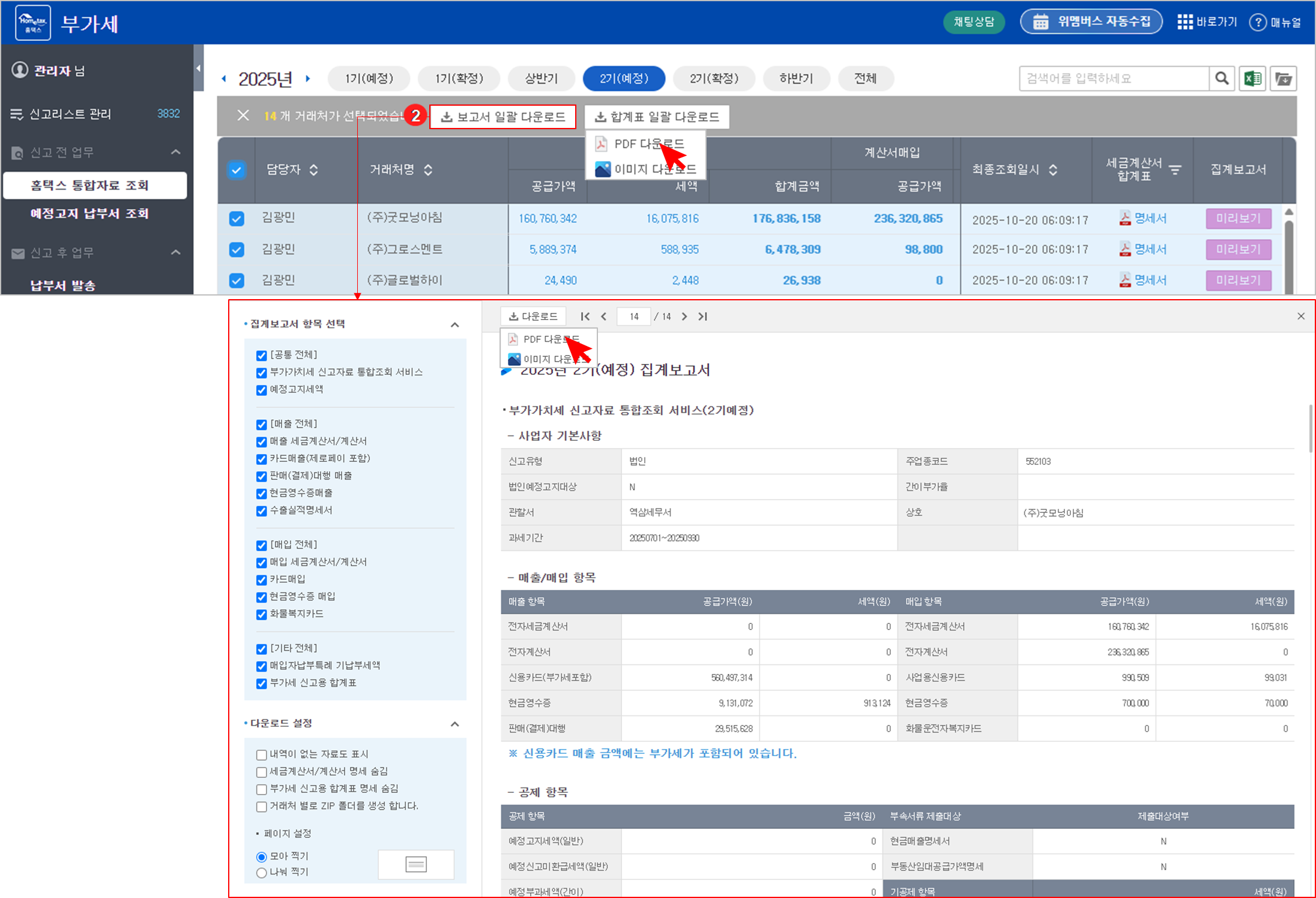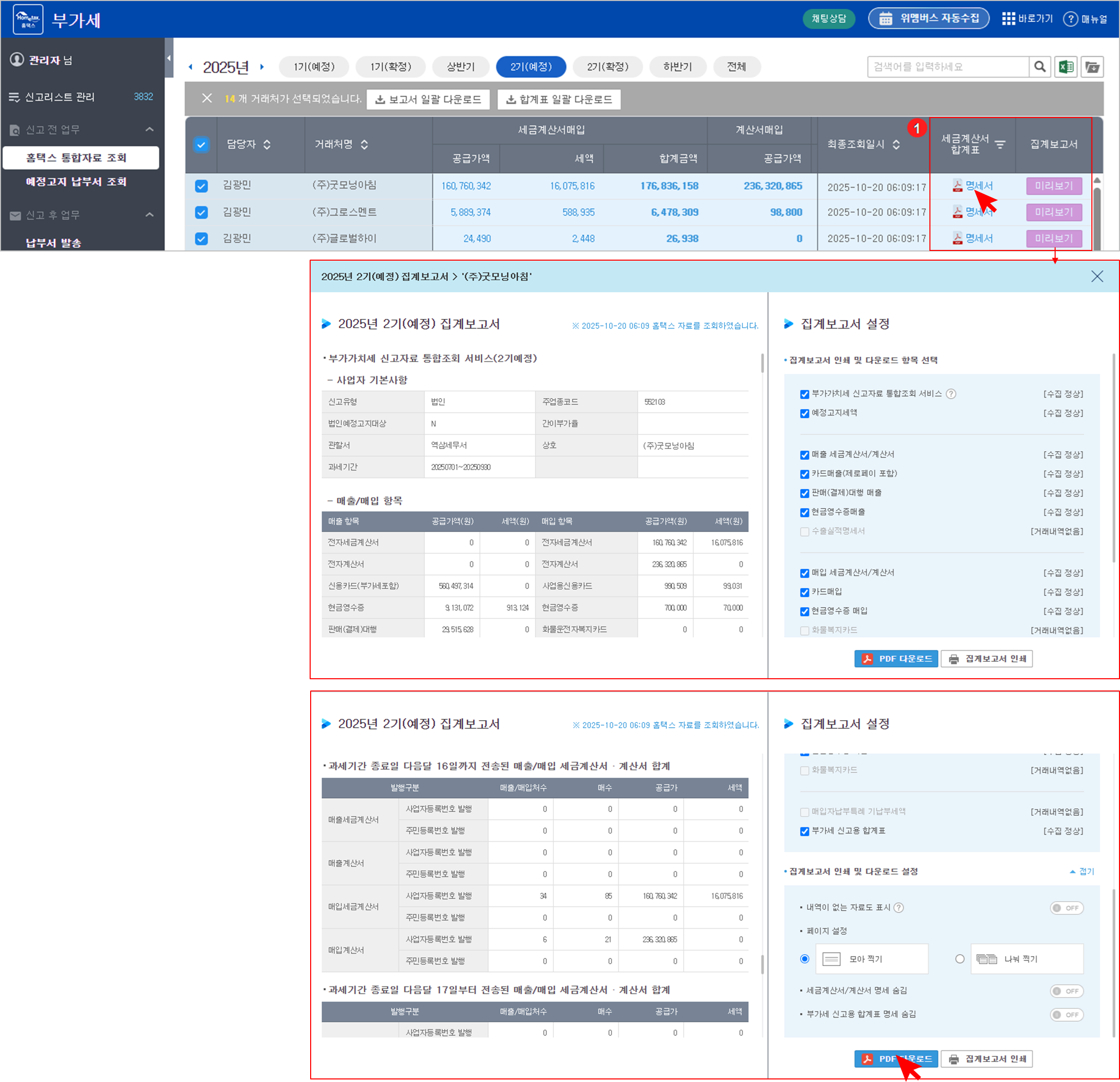 여러 거래처의 합계표 및 집계보고서를 한 번에 다운로드할 수 있습니다.