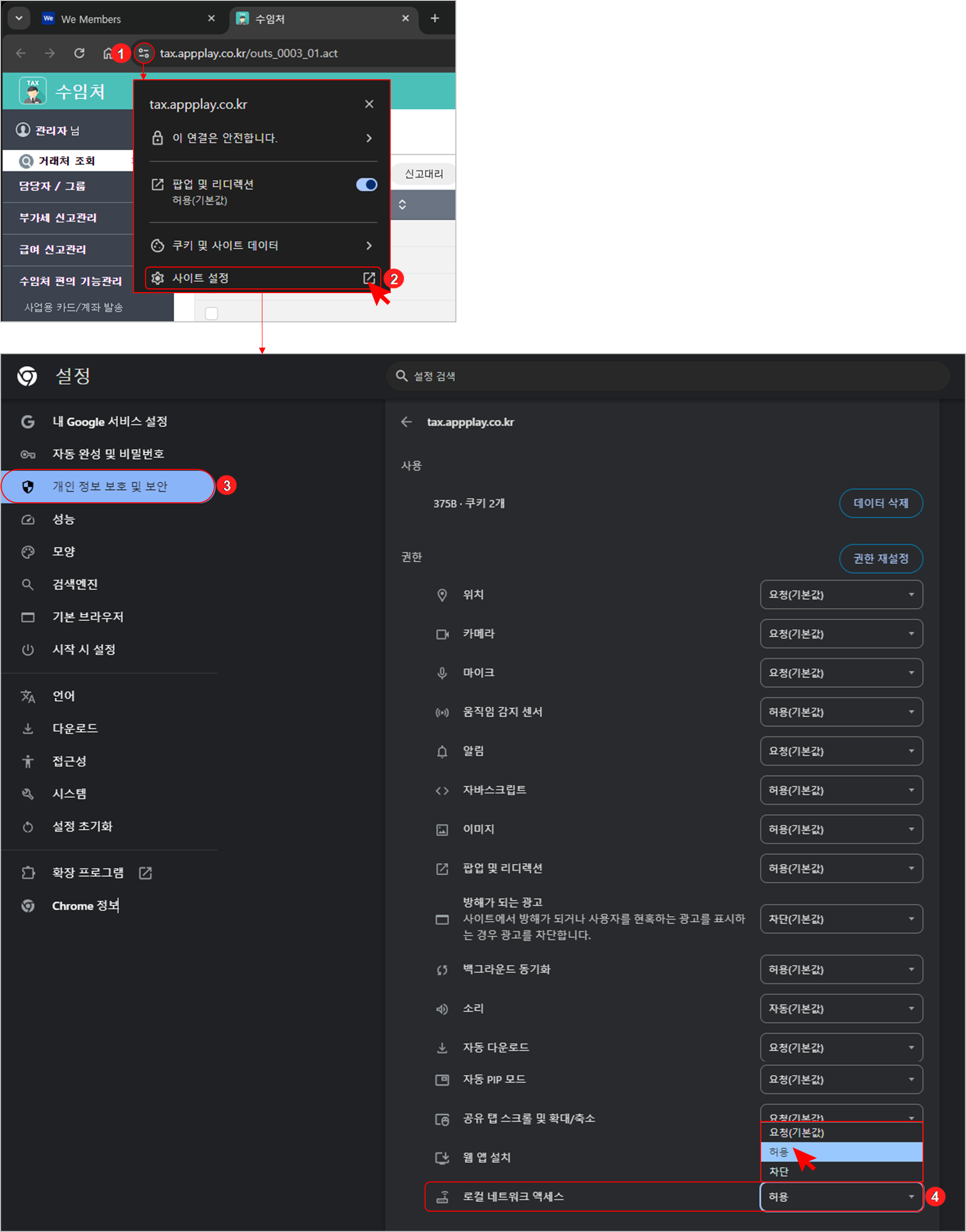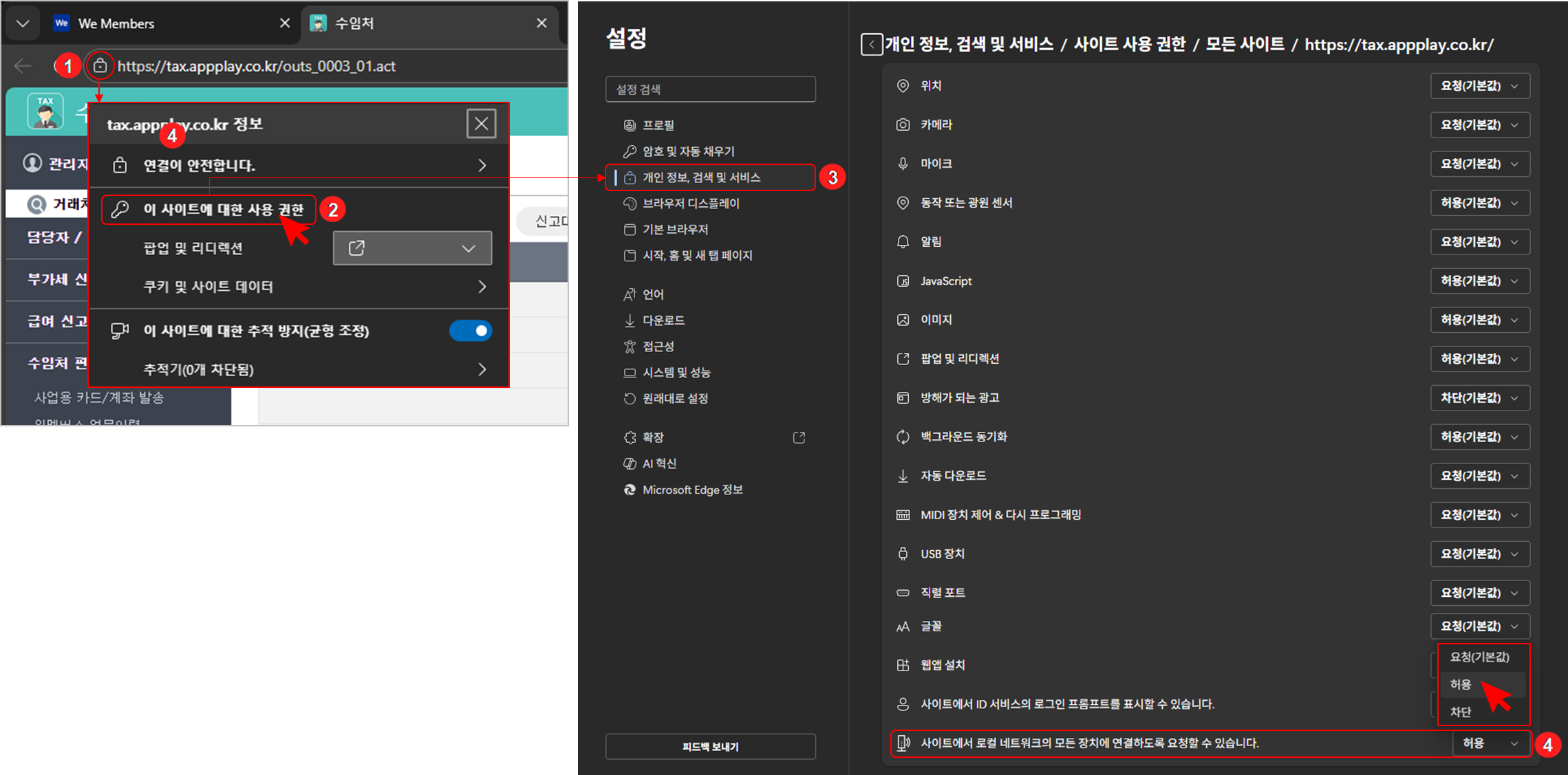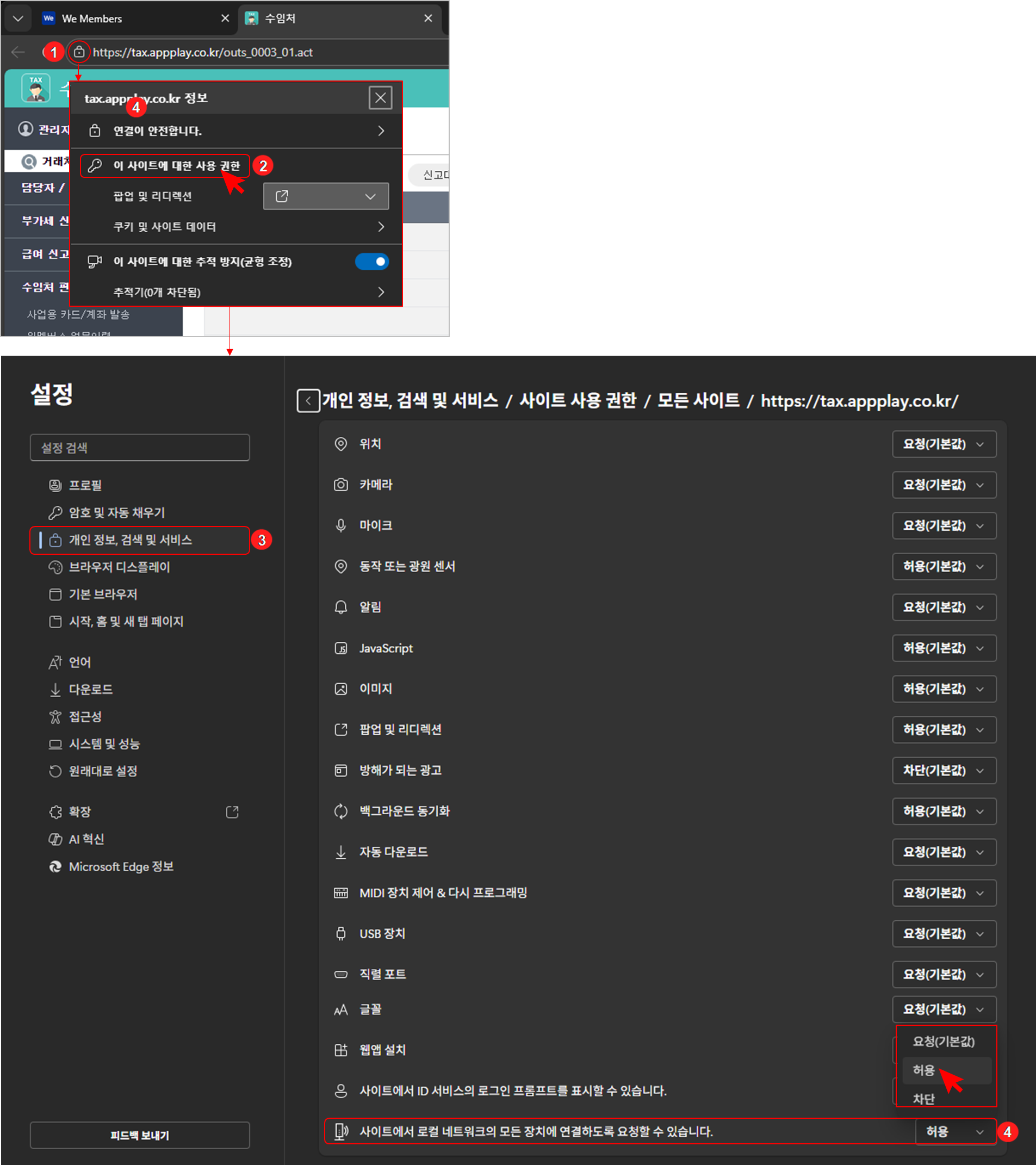 ④ 스크롤을 아래로 내려 [사이트에서 로컬 네트워크의 모든 장치에 연결하도록 요청할 수 있습니다] 설정값을 '허용' 으로 변경