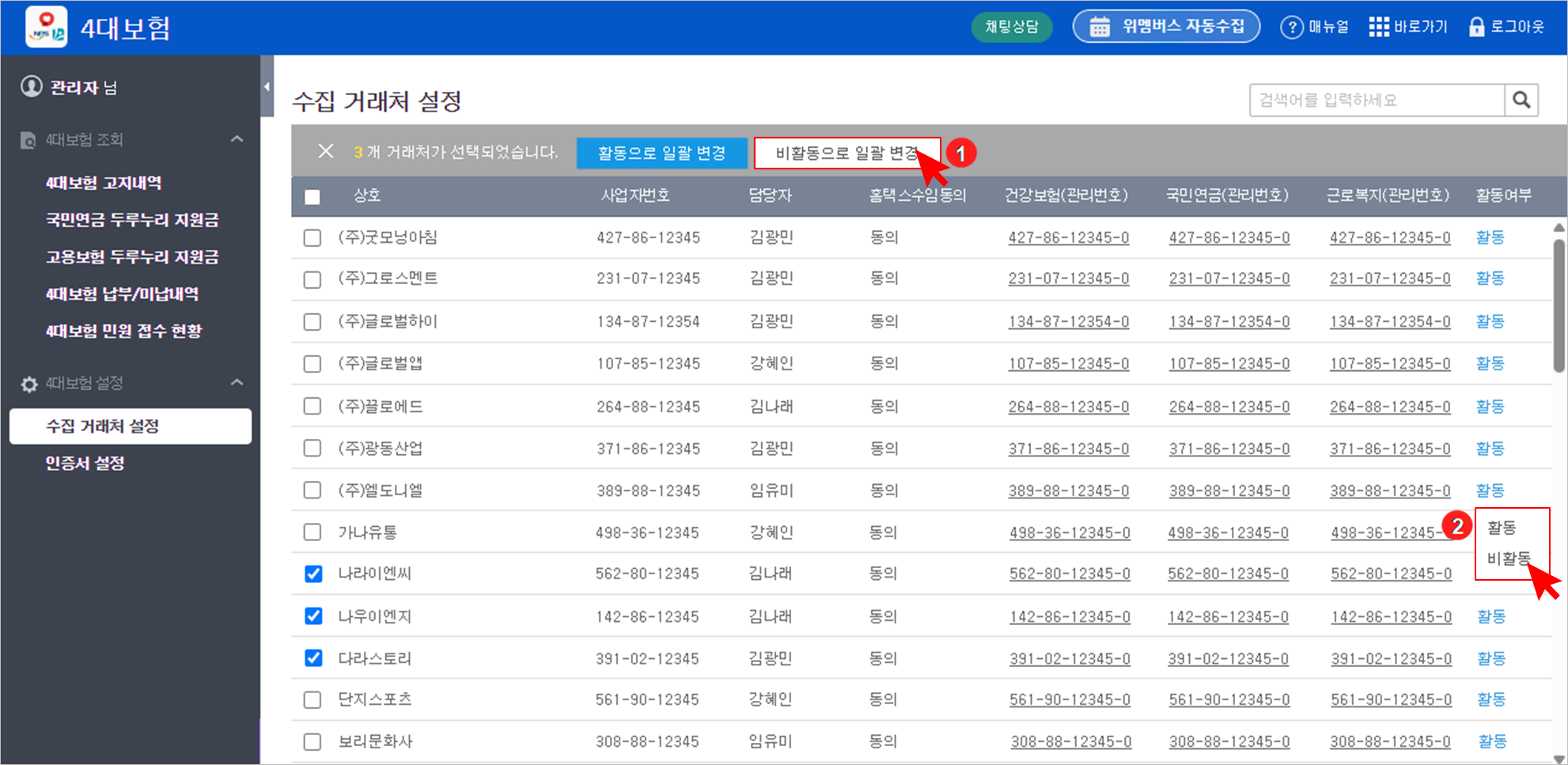 4대보험 조회 대상이 아닌 거래처는 상태를 ‘비활동’으로 변경해 주세요.