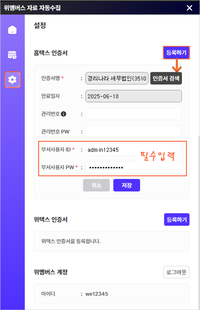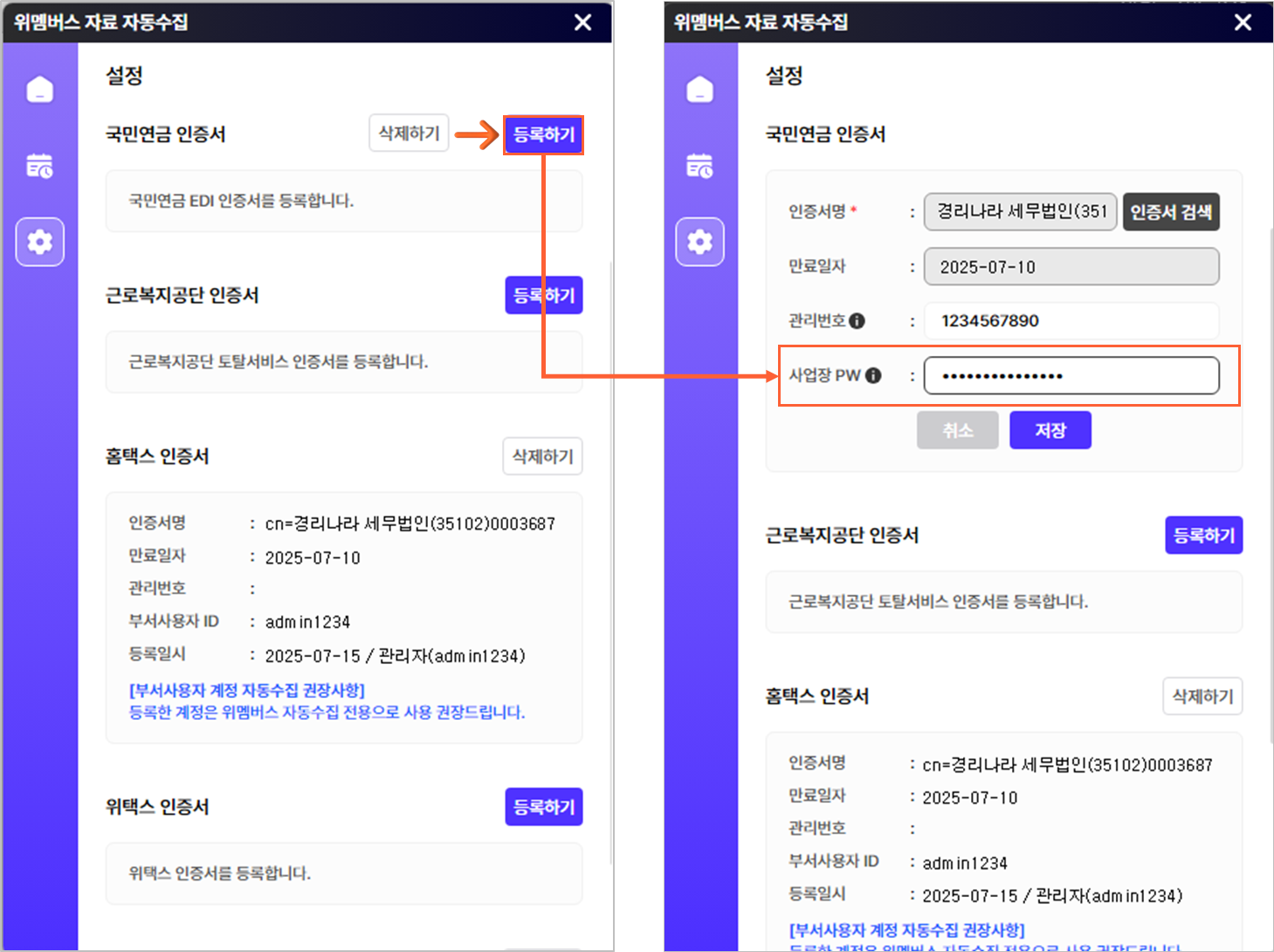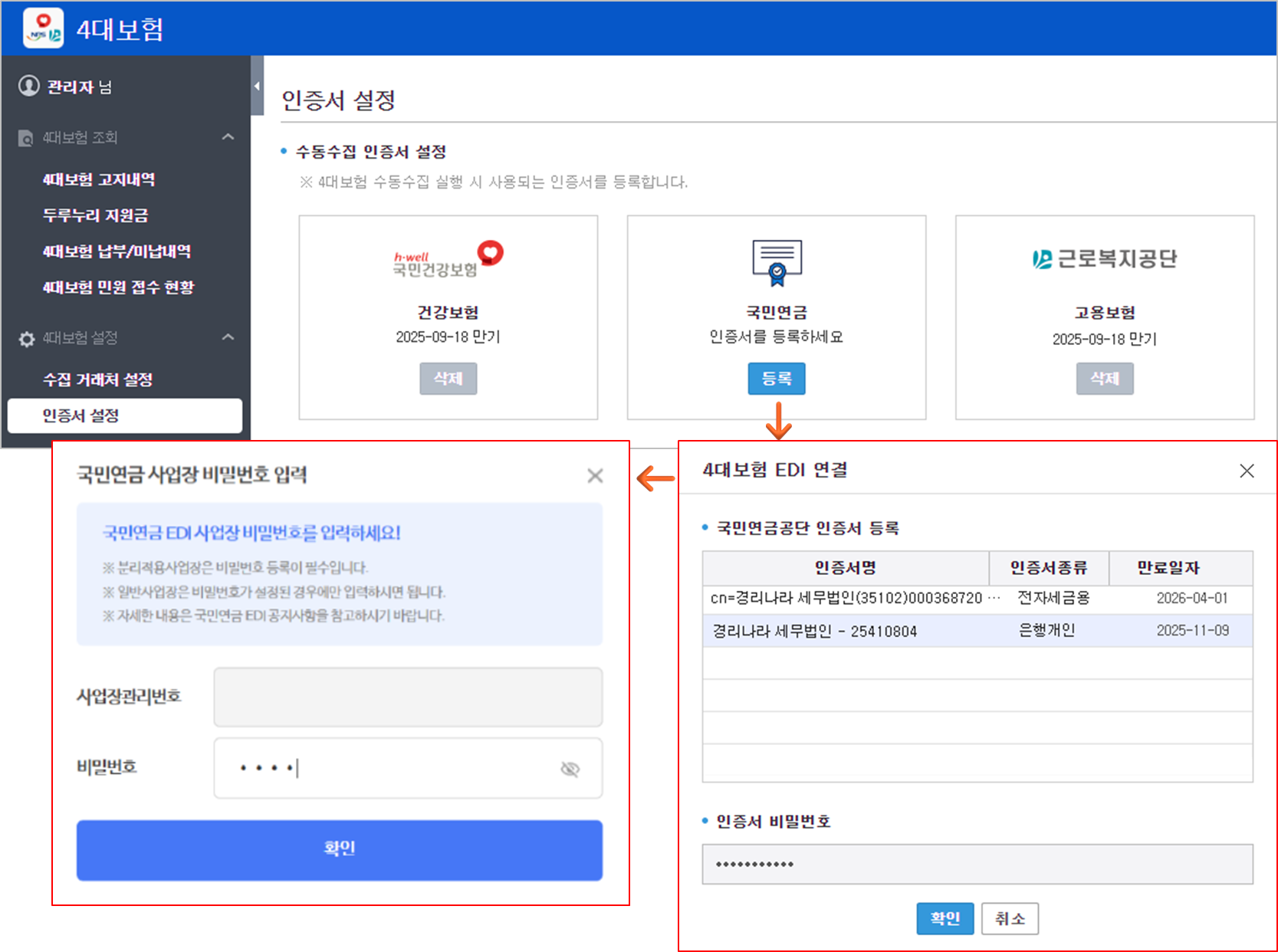설정 경로 : 4대보험 앱 > 인증서 설정 > 수동 수집 인증서 설정