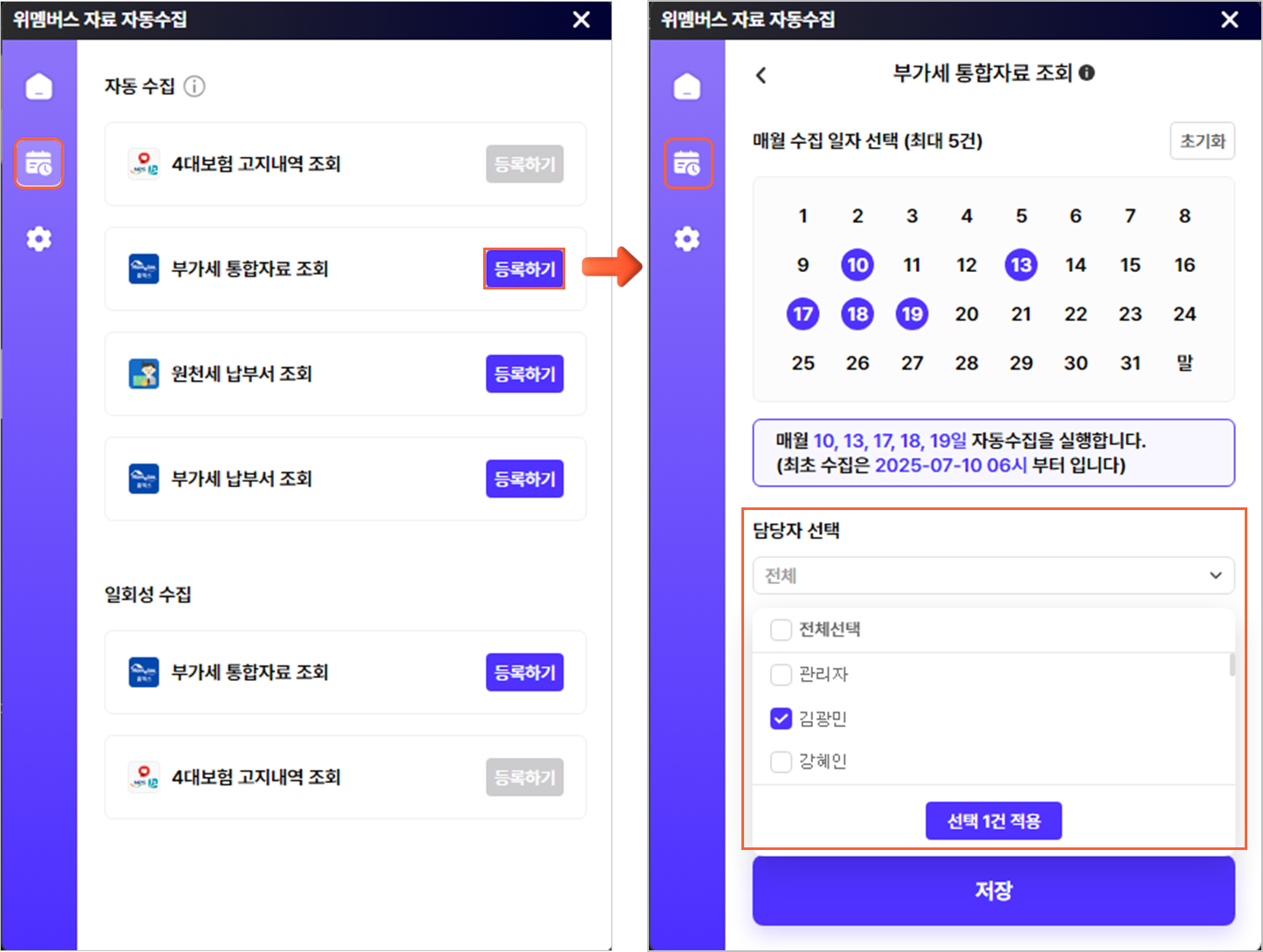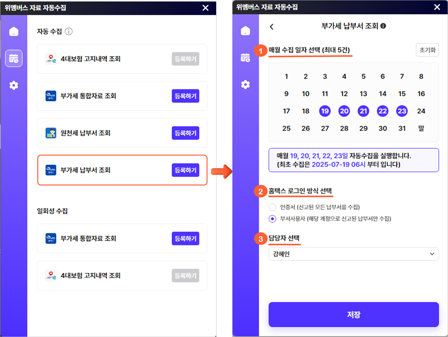 자동 조회 : 부가세 통합자료, 4대보험 고지내역