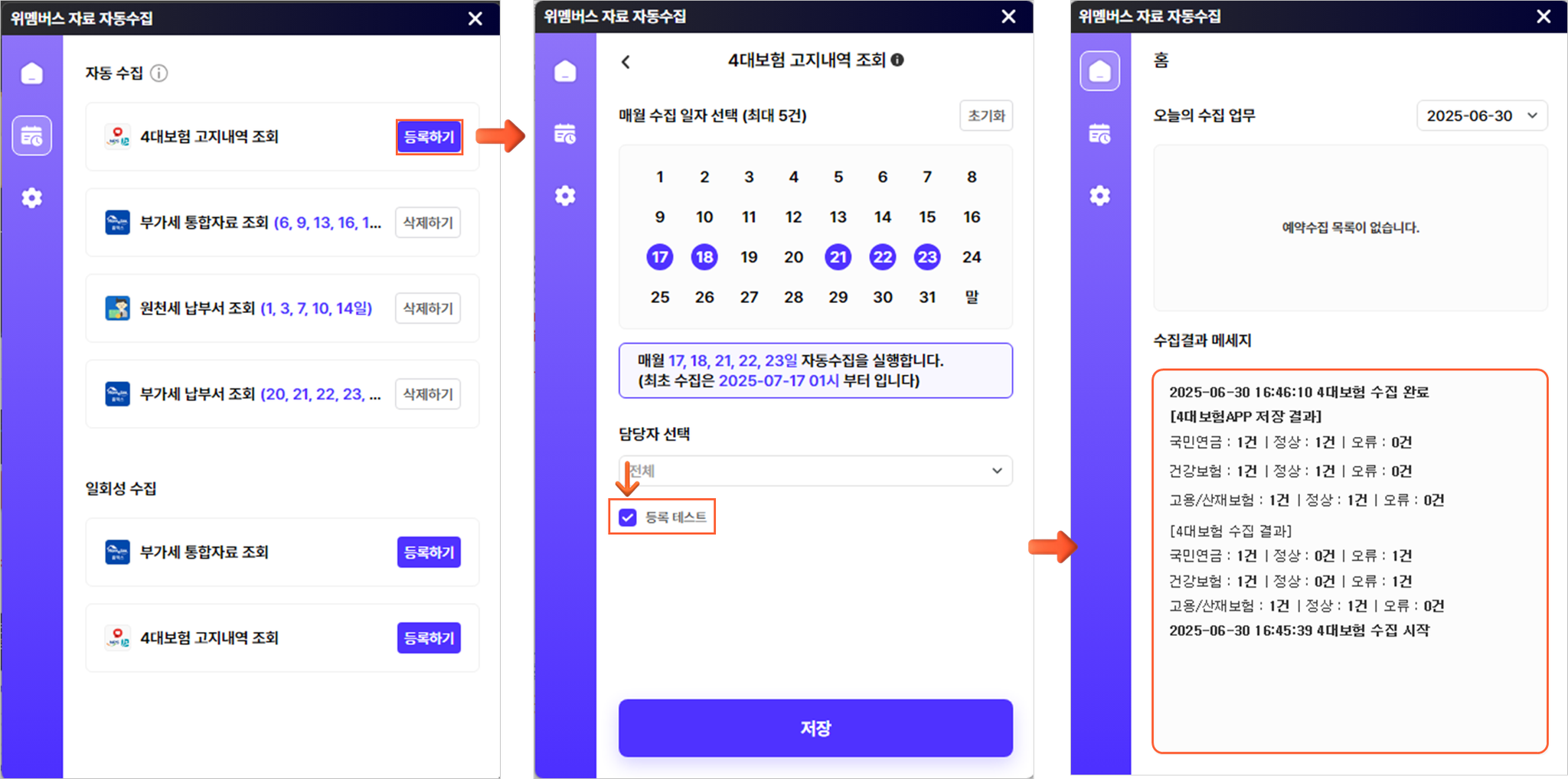 4대보험 고지내역 ‘등록테스트’ 기능에 국민연금 수집 기능이 추가되었습니다.