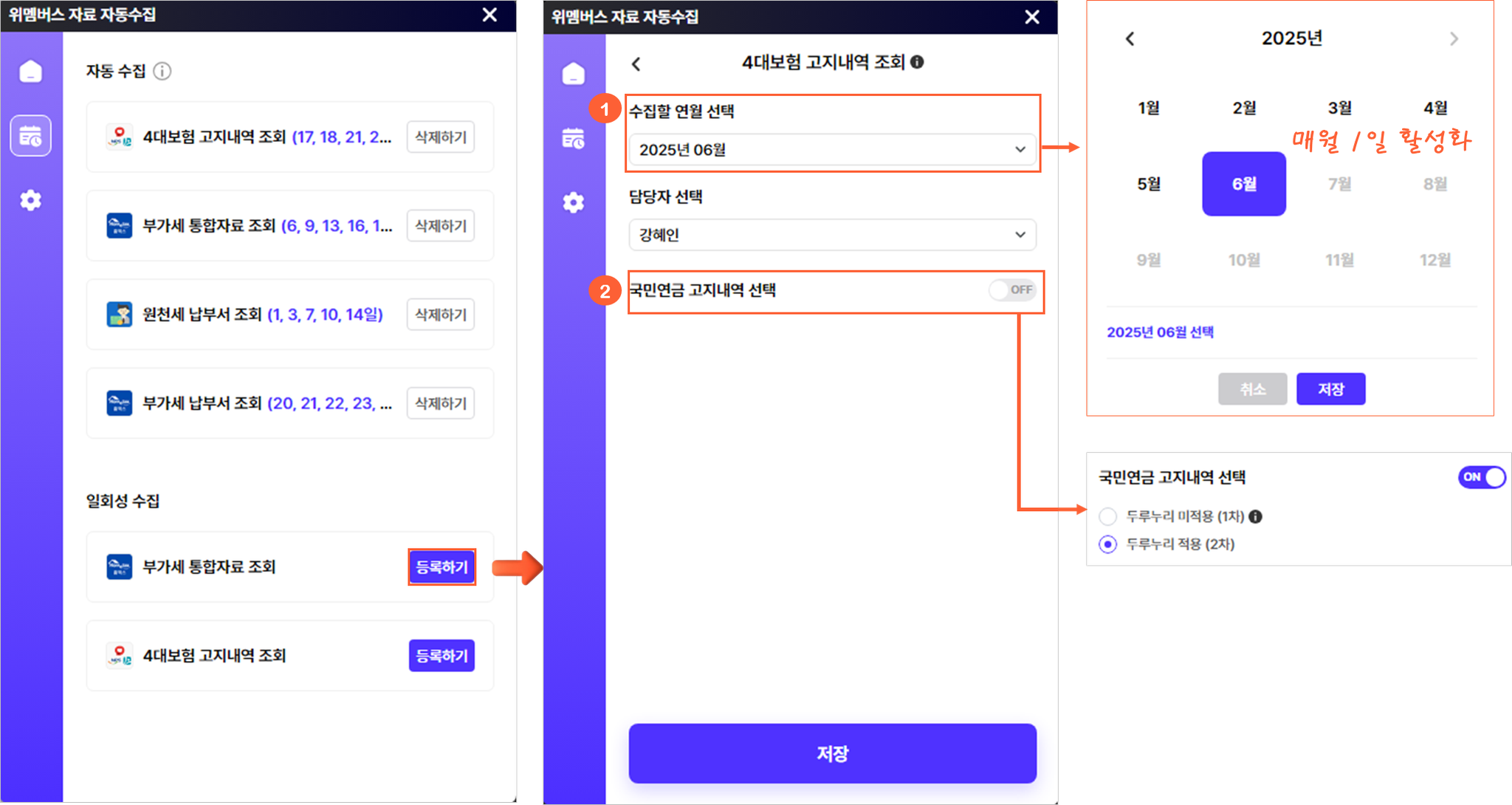 - 4대보험 일회성 수집 시 ‘연월 캘린더’ 기능이 개선되었습니다.