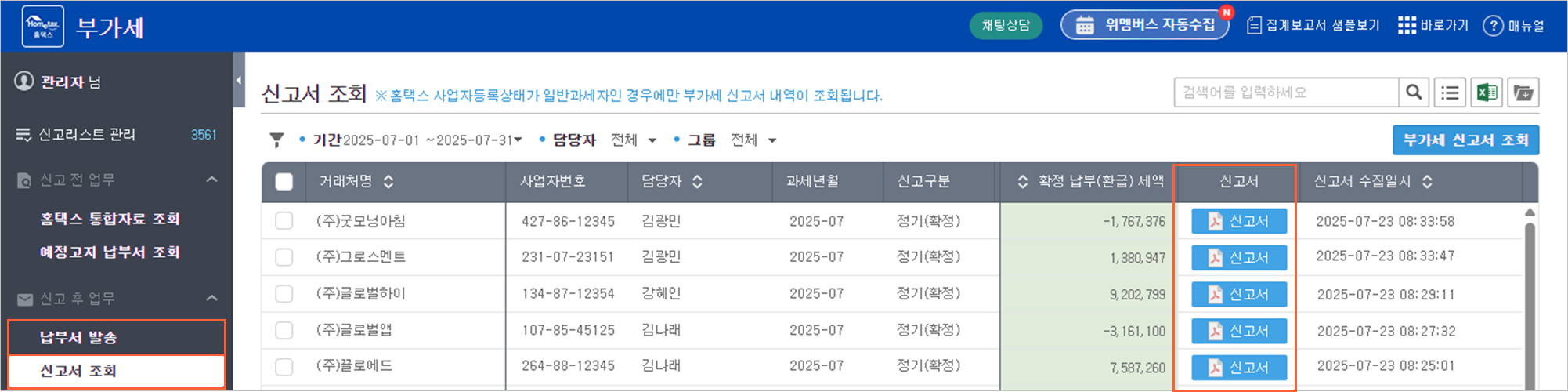 경로 : 부가세 앱 > 납부설 발송, 신고서 조회