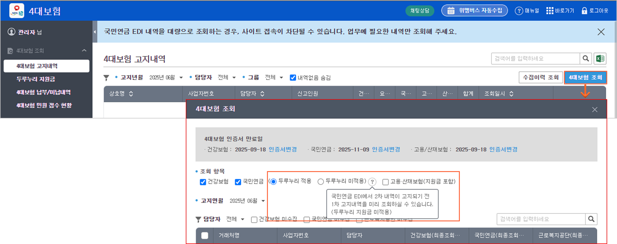 두루누리 미적용 옵션 선택 시 1차 고지 내역의 소급분 내역이 수집됩니다.