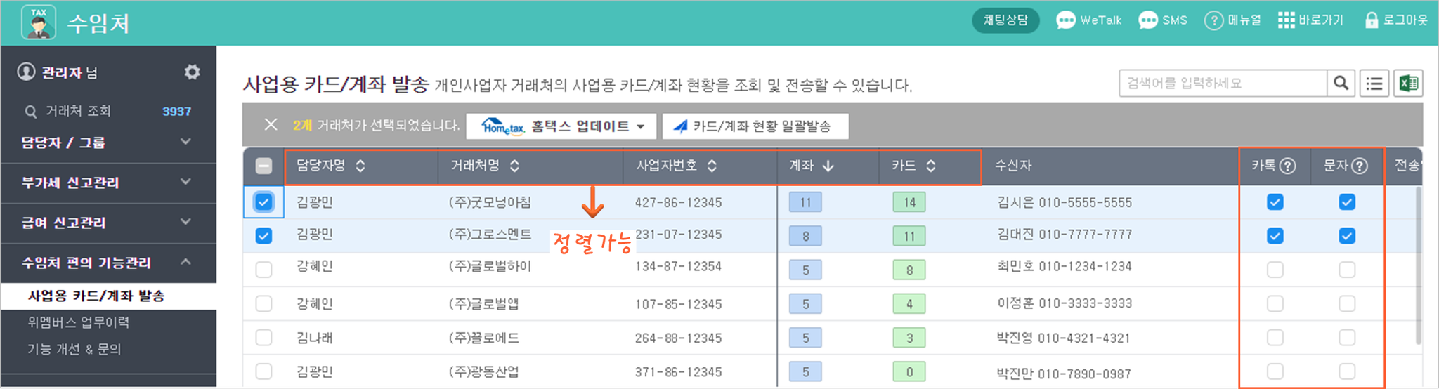 경로 : 수임처 앱 > 사업용카드/ 계좌 발송