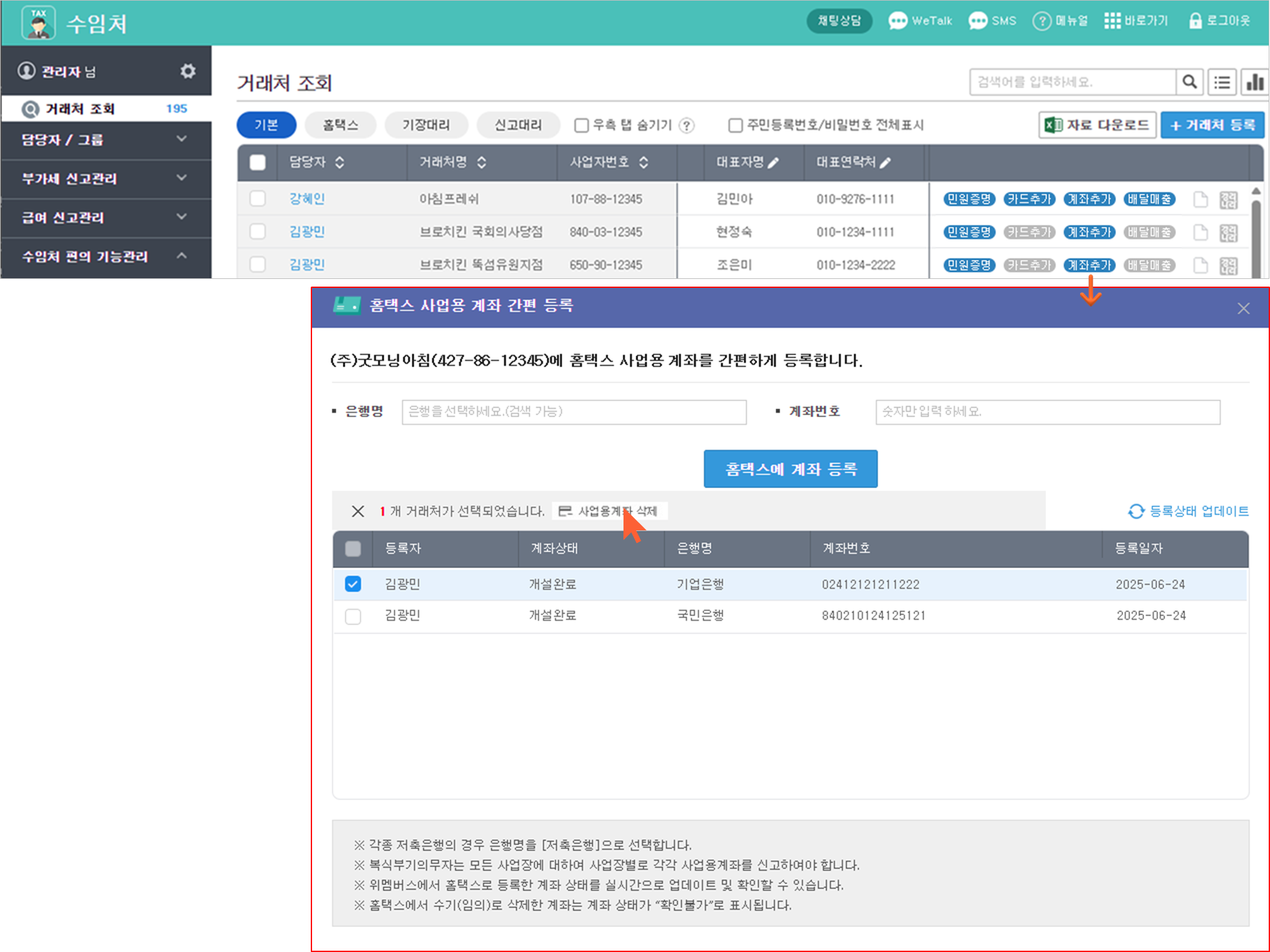수임처 앱에서 등록한 홈택스 사업용 계좌에 한해 삭제 가능합니다.
