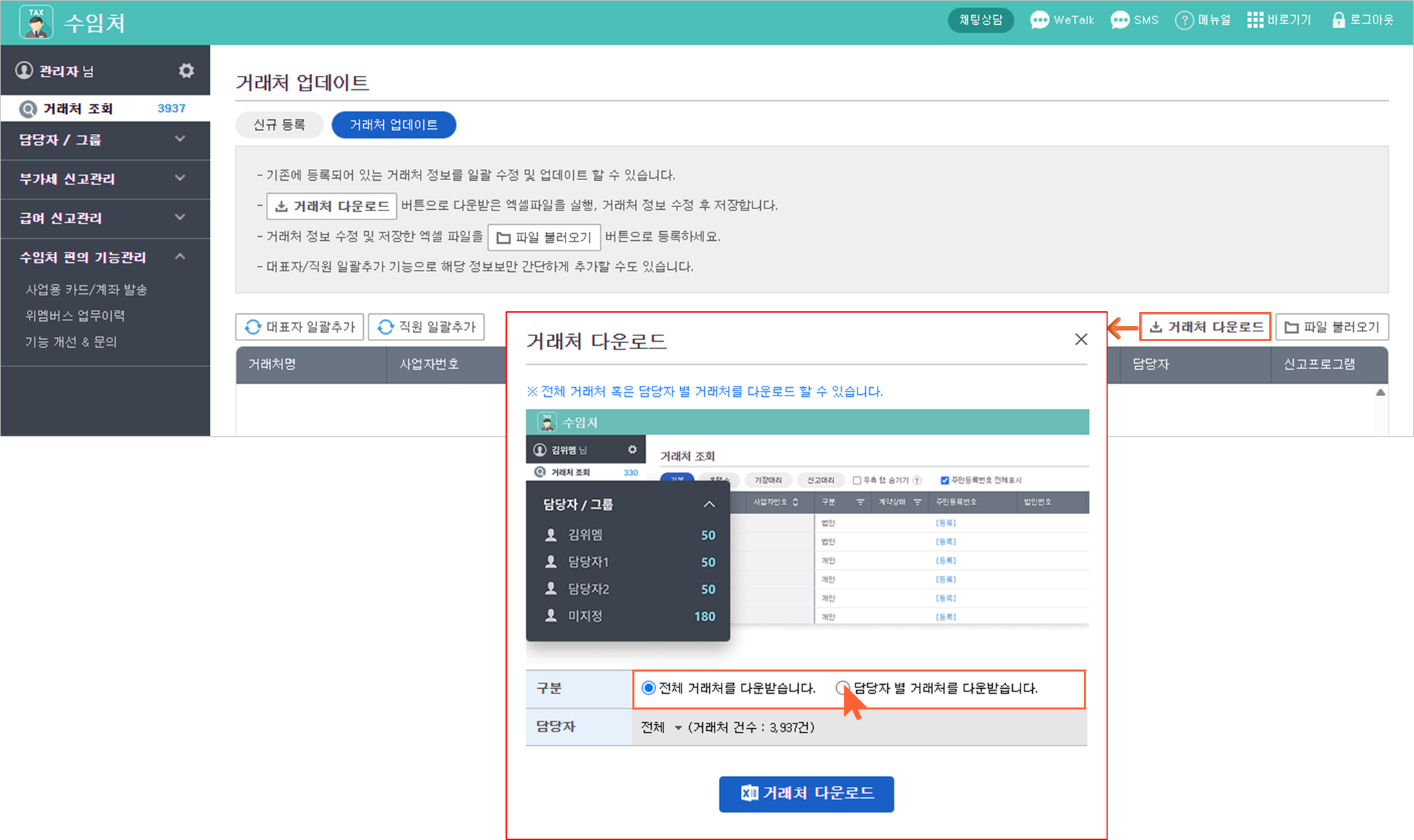 거래처 목록 다운로드 시 ‘전체’ 또는 ‘담당자’ 별로 선택 다운 받을 수 있도록 기능이 추가 되었습니다.