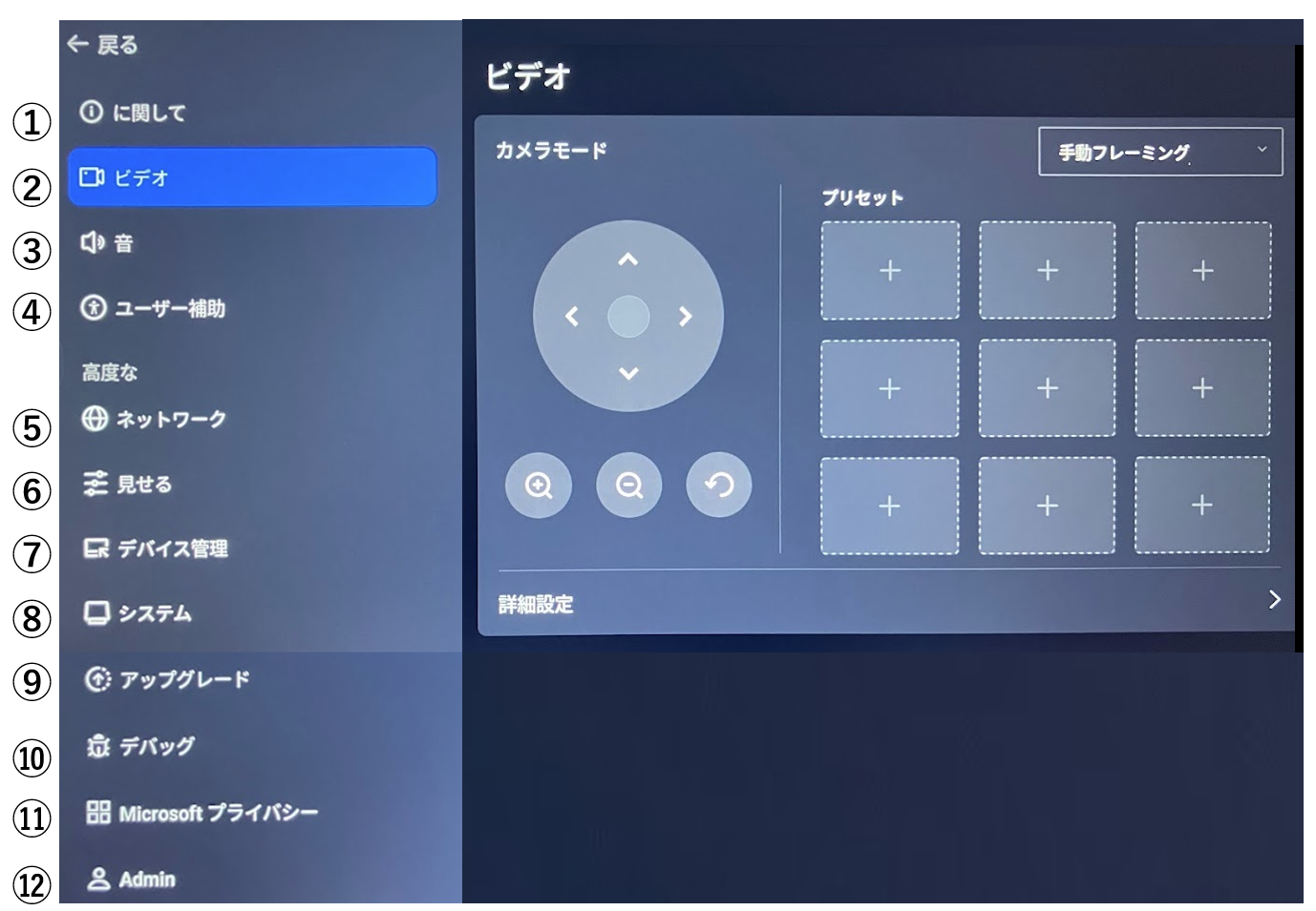 ②ビデオ:カメラの画角調整、カメラモードの変更、プリセットの登録などが行えます。詳細は、こちらをご覧ください。