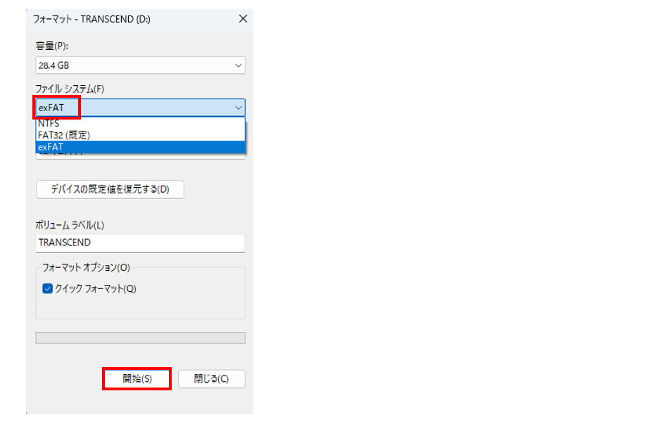 「開始」ボタンを押下するとUSBメモリが初期化されます。