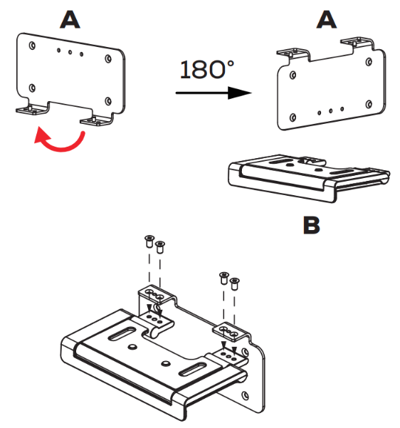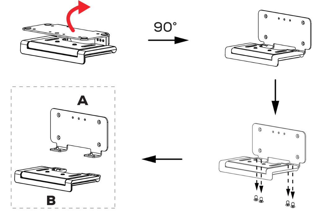 (1) 下記絵のようにブラケット底部を90度開き、接合部の4本のネジを外して、ブラケットをAとBの2つの部品に分解します。