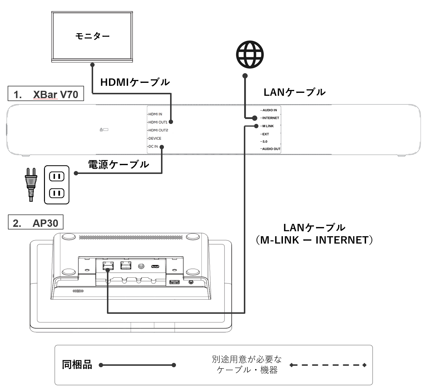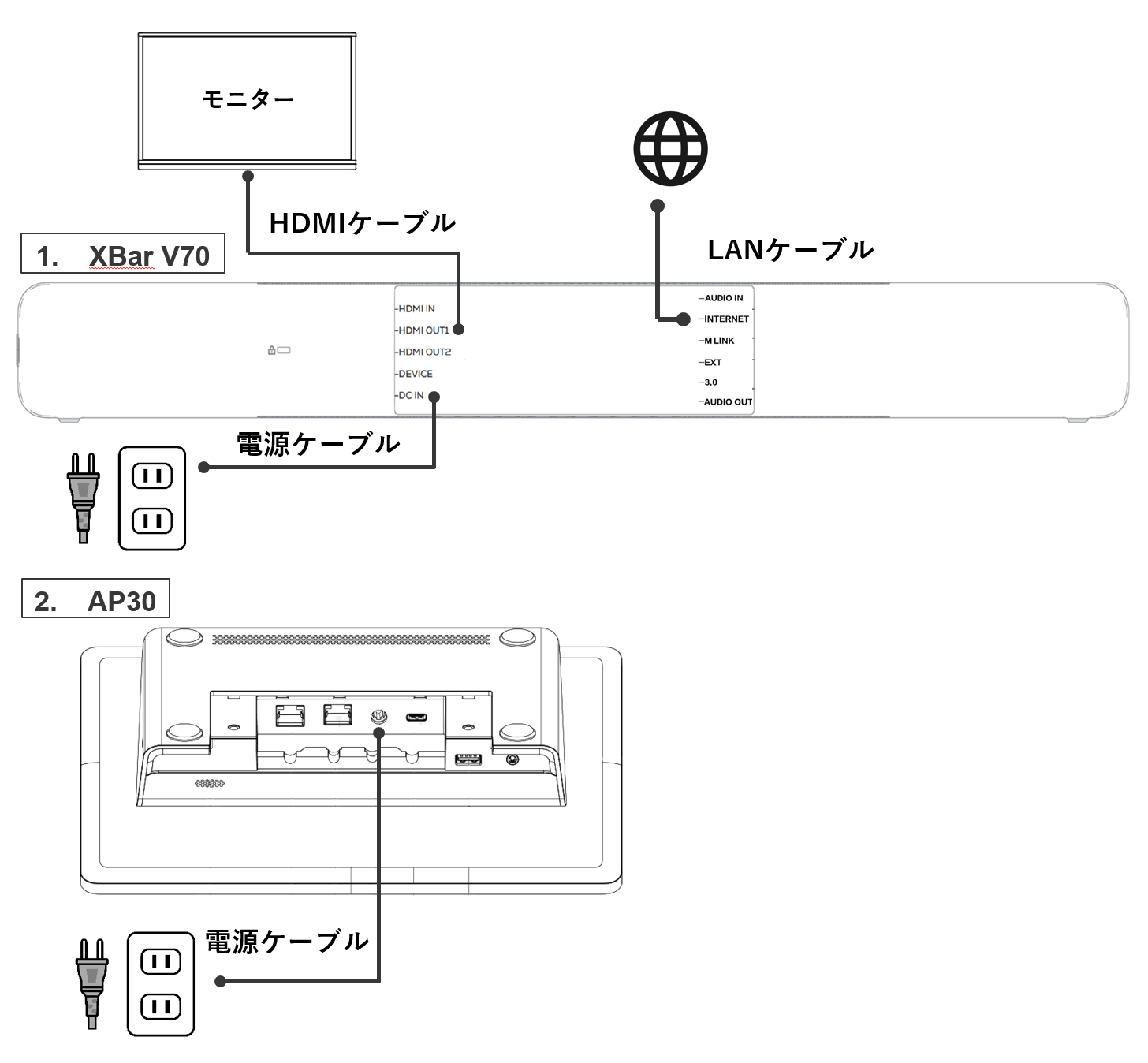 AP30とXBar V70を同梱のLANケーブル(7.5m)で直接接続する場合、電源はXBar V70からPoEで供給されるため、AP30の電源ケーブルは必須ではありません。AP30に電源ケーブルを追加で接続すると、AP30からType-Cケーブルを使用してPCを充電できるようになります。(PD 65W対応)